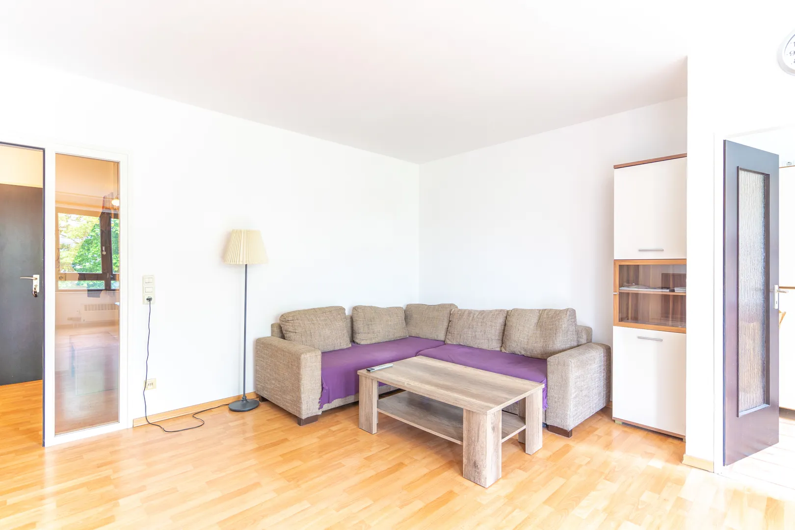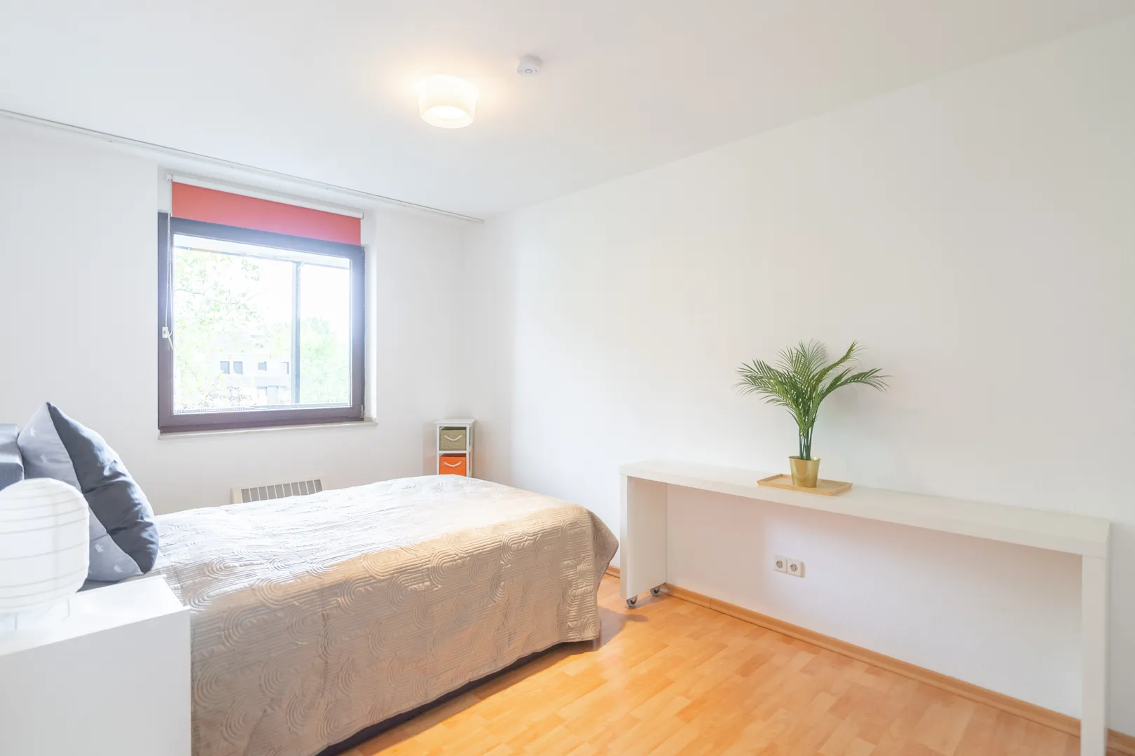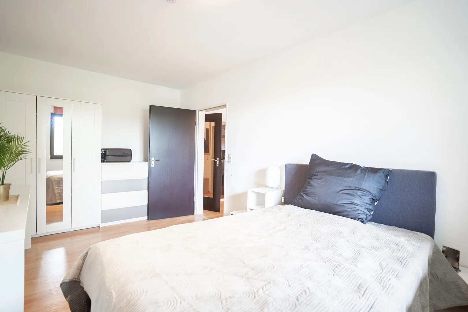 Dank der großen Fenster gelangt viel Tageslicht in den gesamten Wohnbereich. Von da aus erreichen Sie das Schlafzimmer, welches genügend Platz für Bett und Schrank bietet.