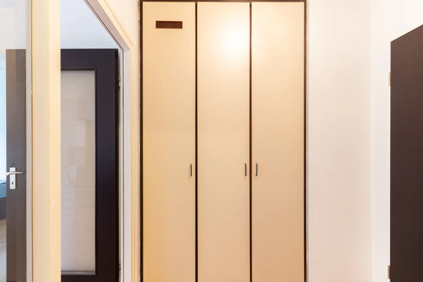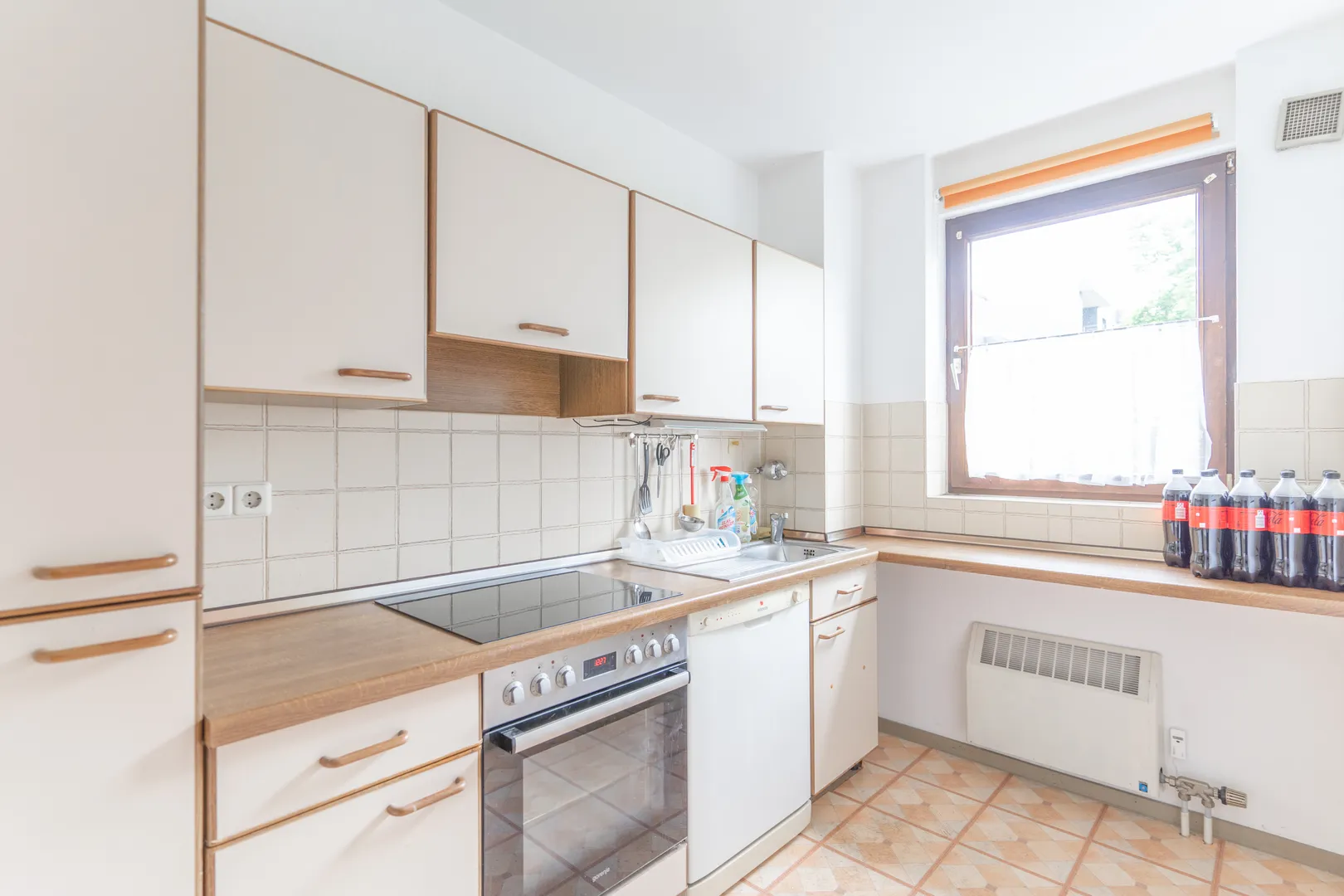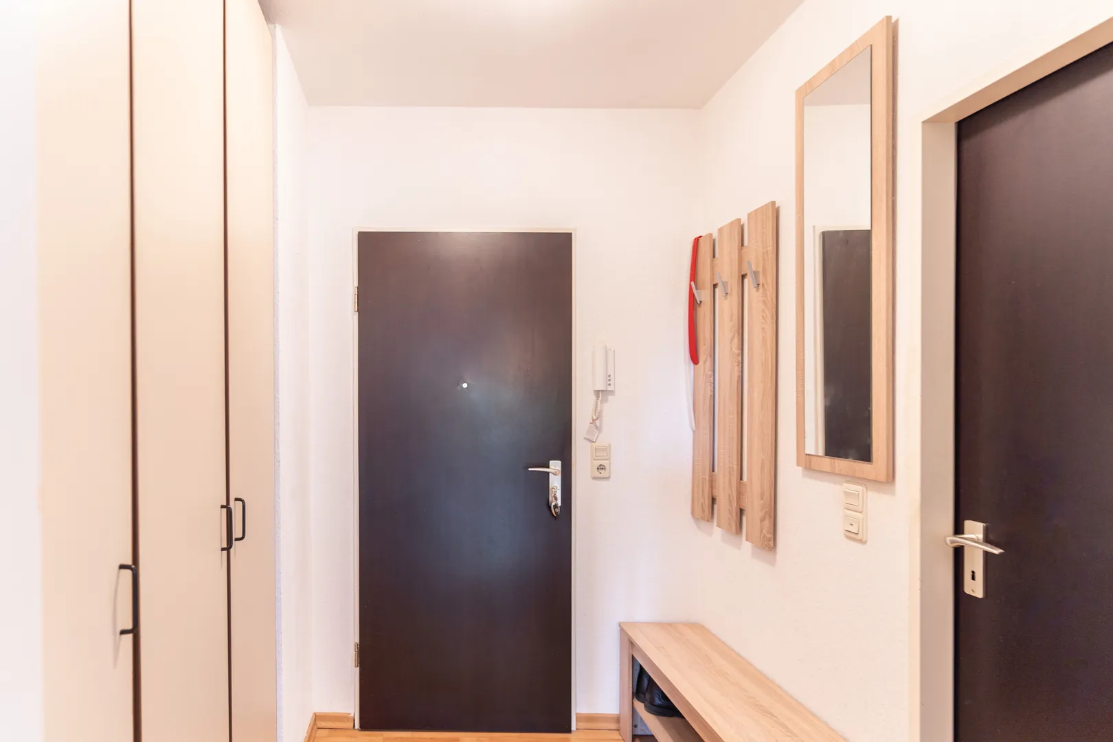 Dank der großen Fenster gelangt viel Tageslicht in den gesamten Wohnbereich. Von da aus erreichen Sie das Schlafzimmer, welches genügend Platz für Bett und Schrank bietet.
