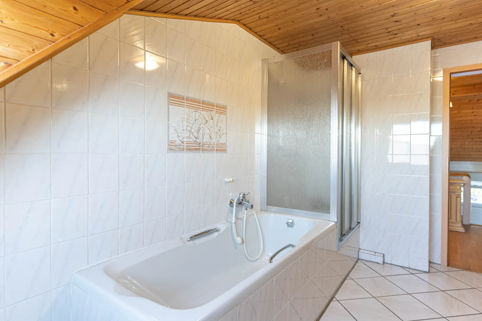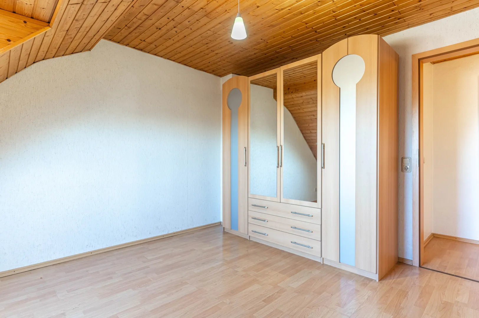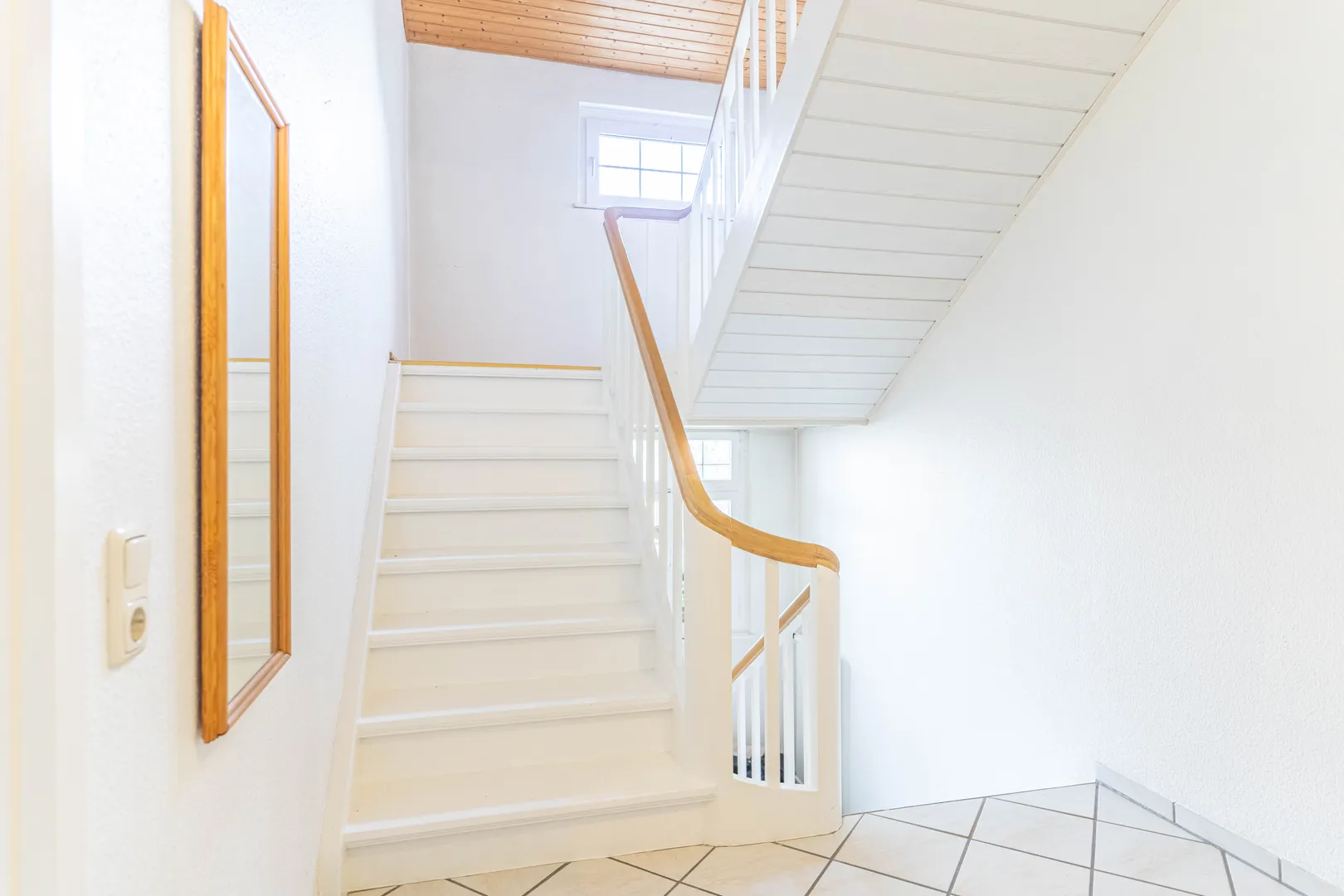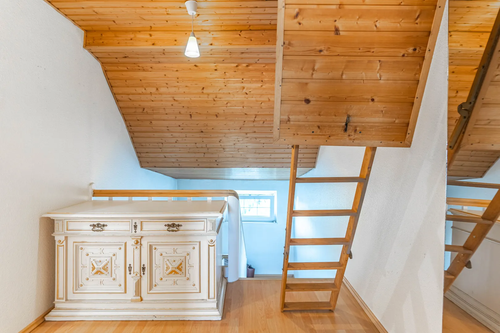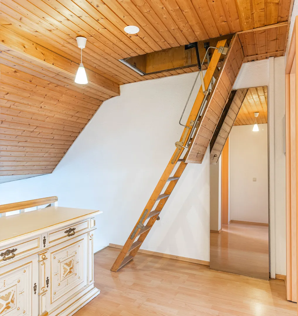 Das Obergeschoss bietet einen praktischen Stauraum mit einer Leiter, die zu einem Lagerbereich führt. Dort finden sich außerdem ein Badezimmer mit Badewanne und Dusche sowie zwei gut geschnittene Zimmer, die als Schlafzimmer oder Büroräume genutzt werden können.