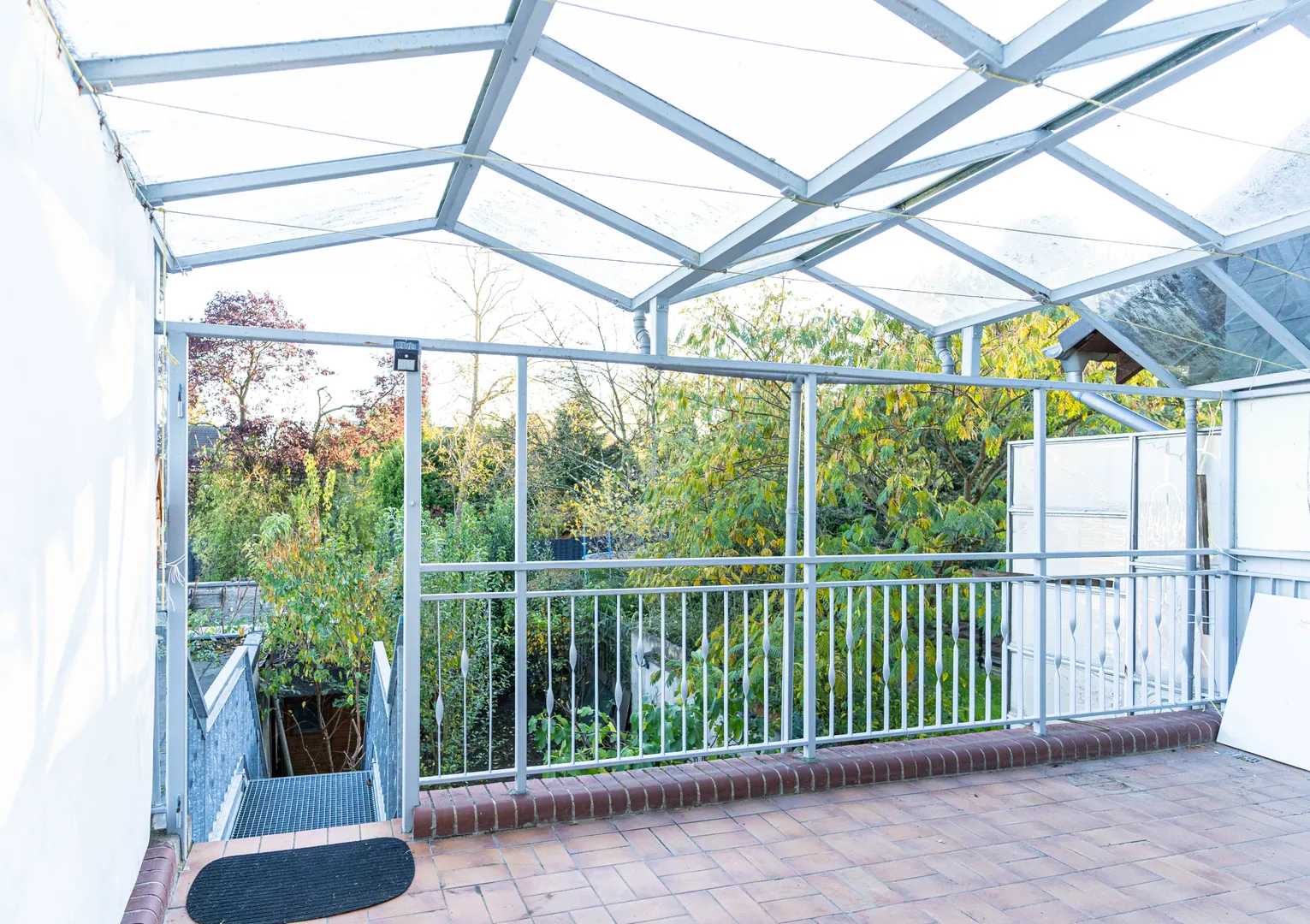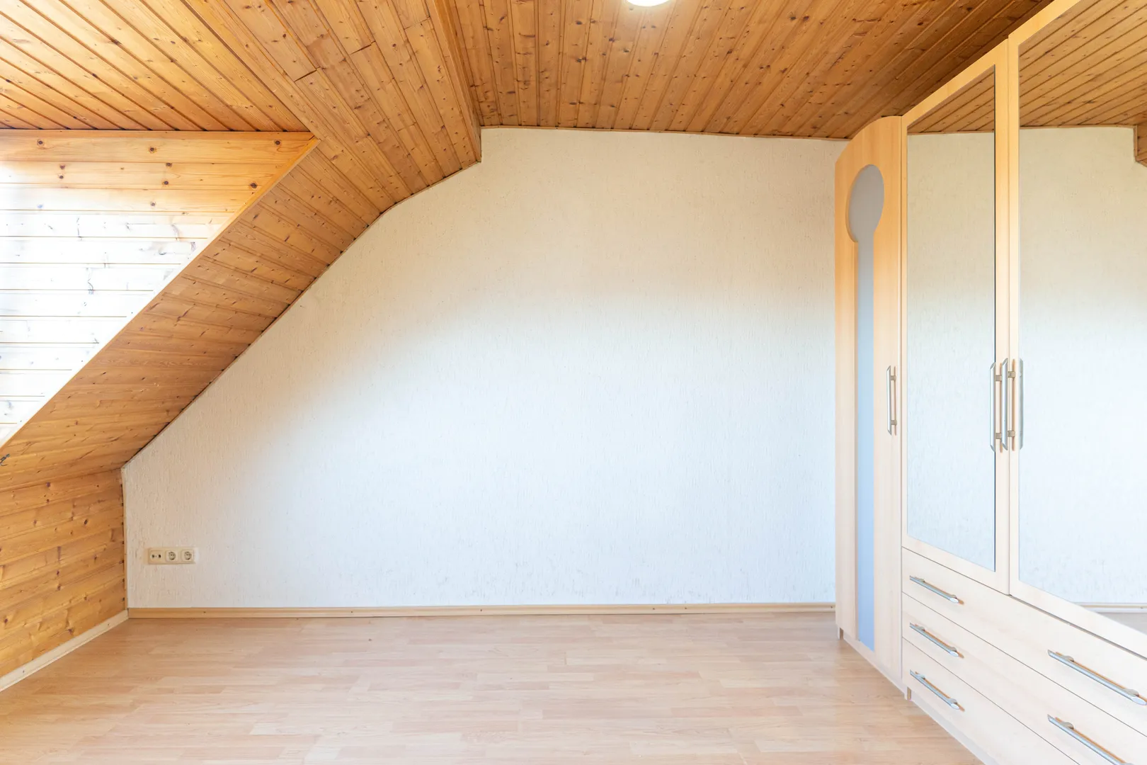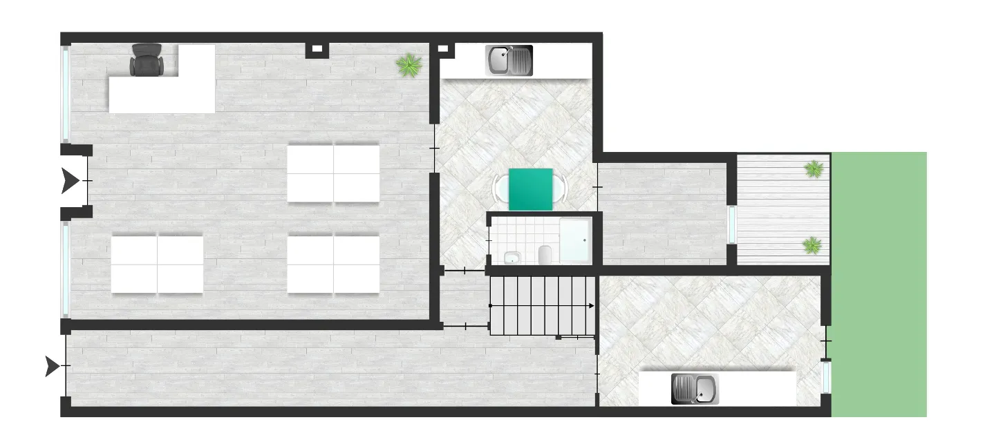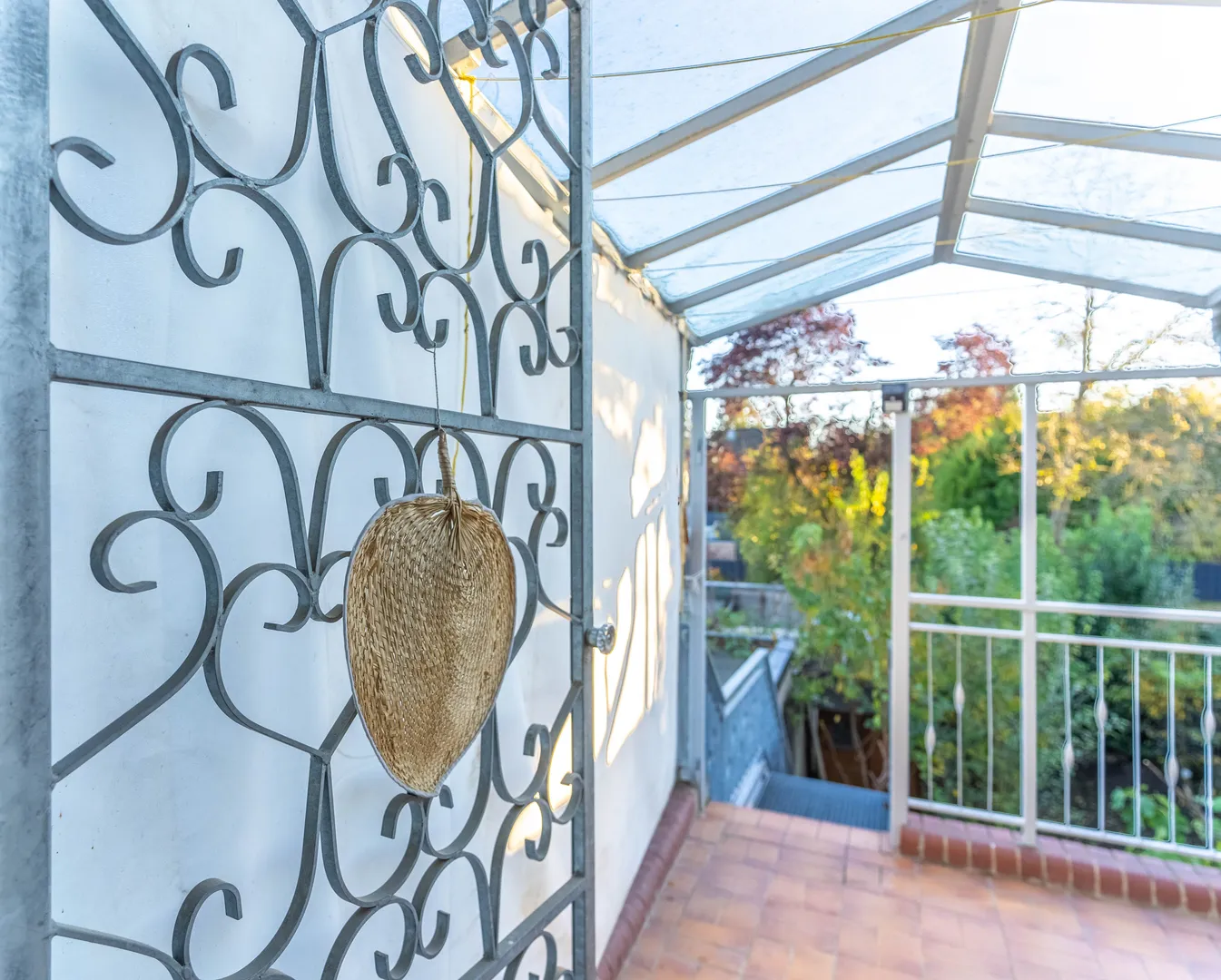 Im Dachgeschoss erwartet Sie ein weiteres Zimmer mit einem angrenzenden kleinen Raum, in dem sich Dusche und Toilette befinden. Das benachbarte Zimmer beherbergt die Küche, und von hier aus gelangt man auf eine Terrasse mit Zugang zum Garten – über eine Treppe können Sie bequem von oben in den Garten gelangen.