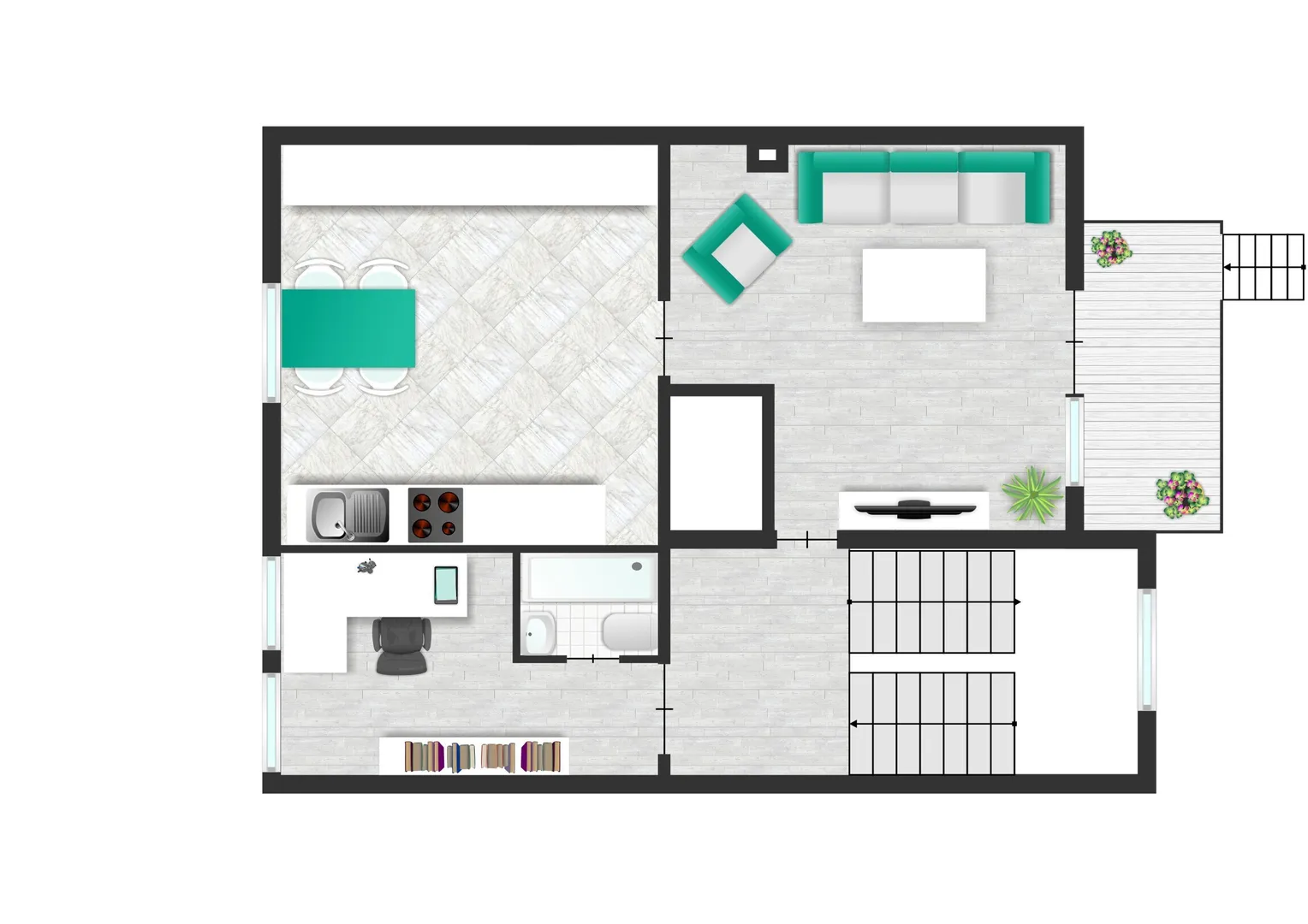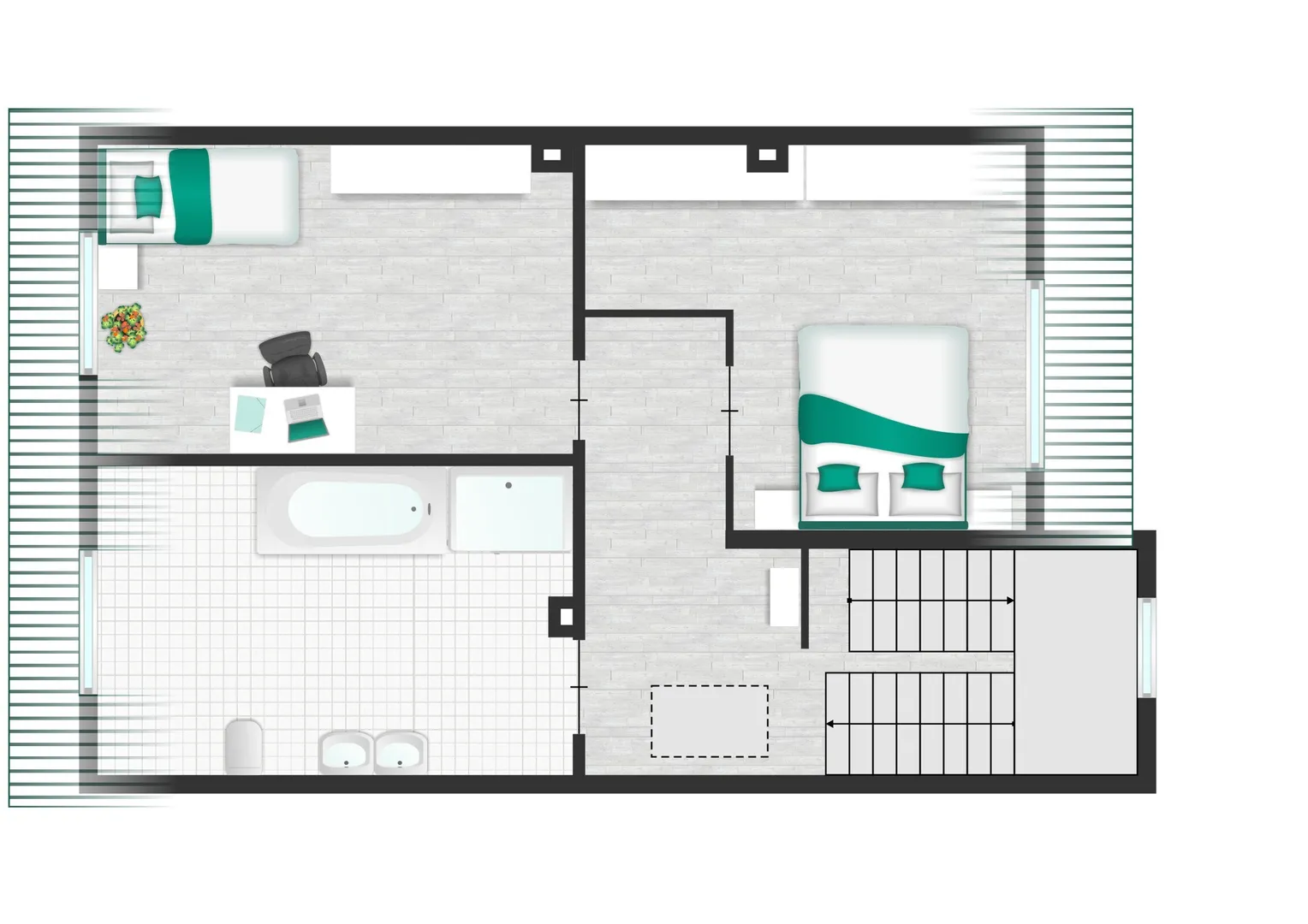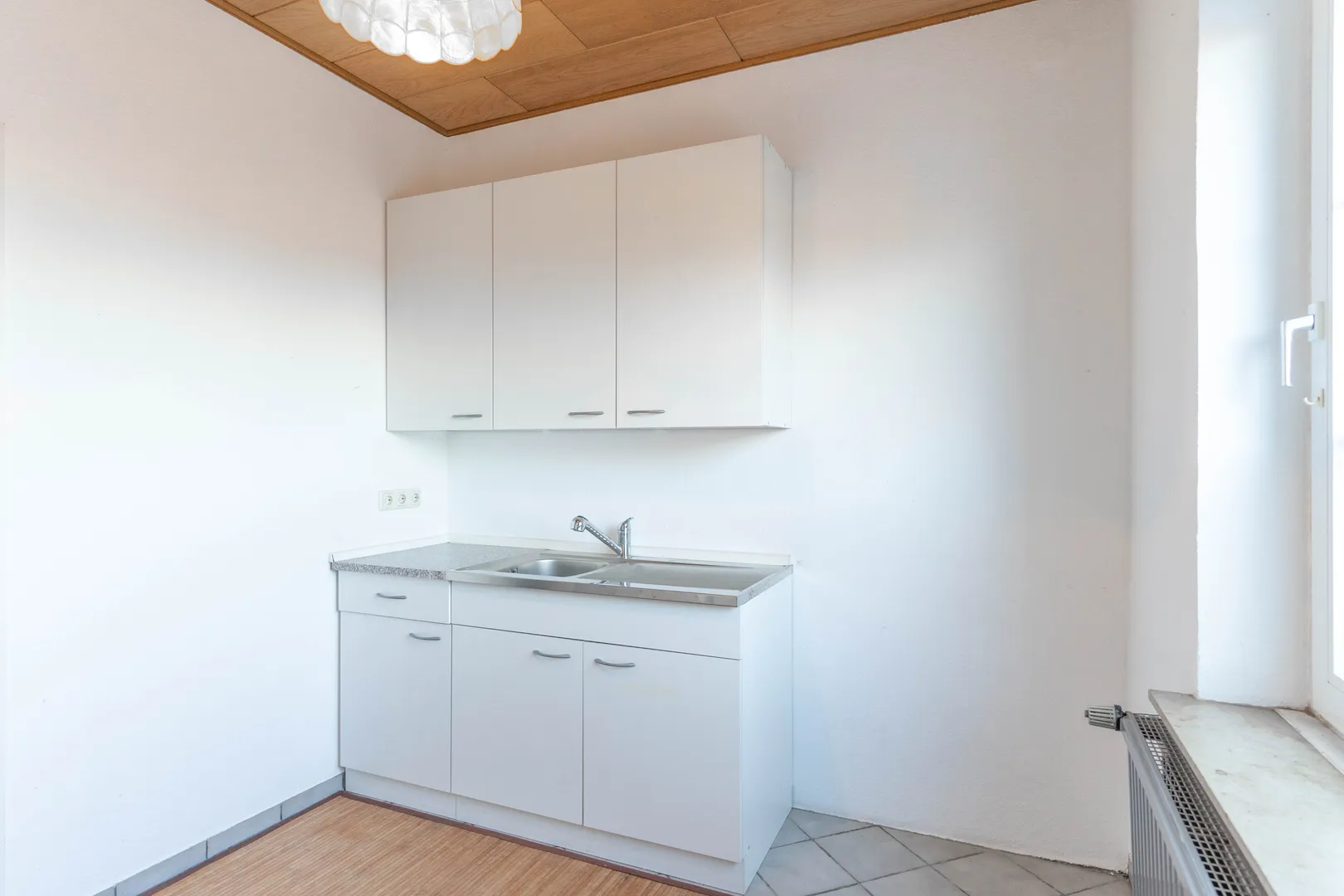 Im Dachgeschoss erwartet Sie ein weiteres Zimmer mit einem angrenzenden kleinen Raum, in dem sich Dusche und Toilette befinden. Das benachbarte Zimmer beherbergt die Küche, und von hier aus gelangt man auf eine Terrasse mit Zugang zum Garten – über eine Treppe können Sie bequem von oben in den Garten gelangen.