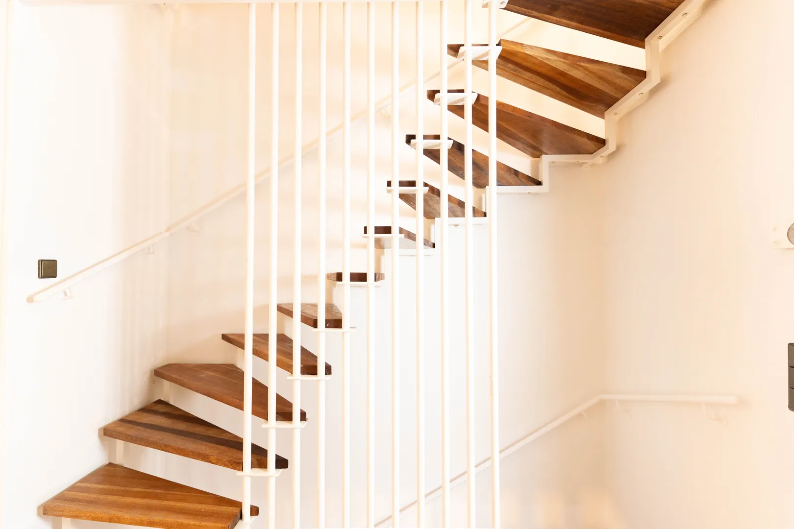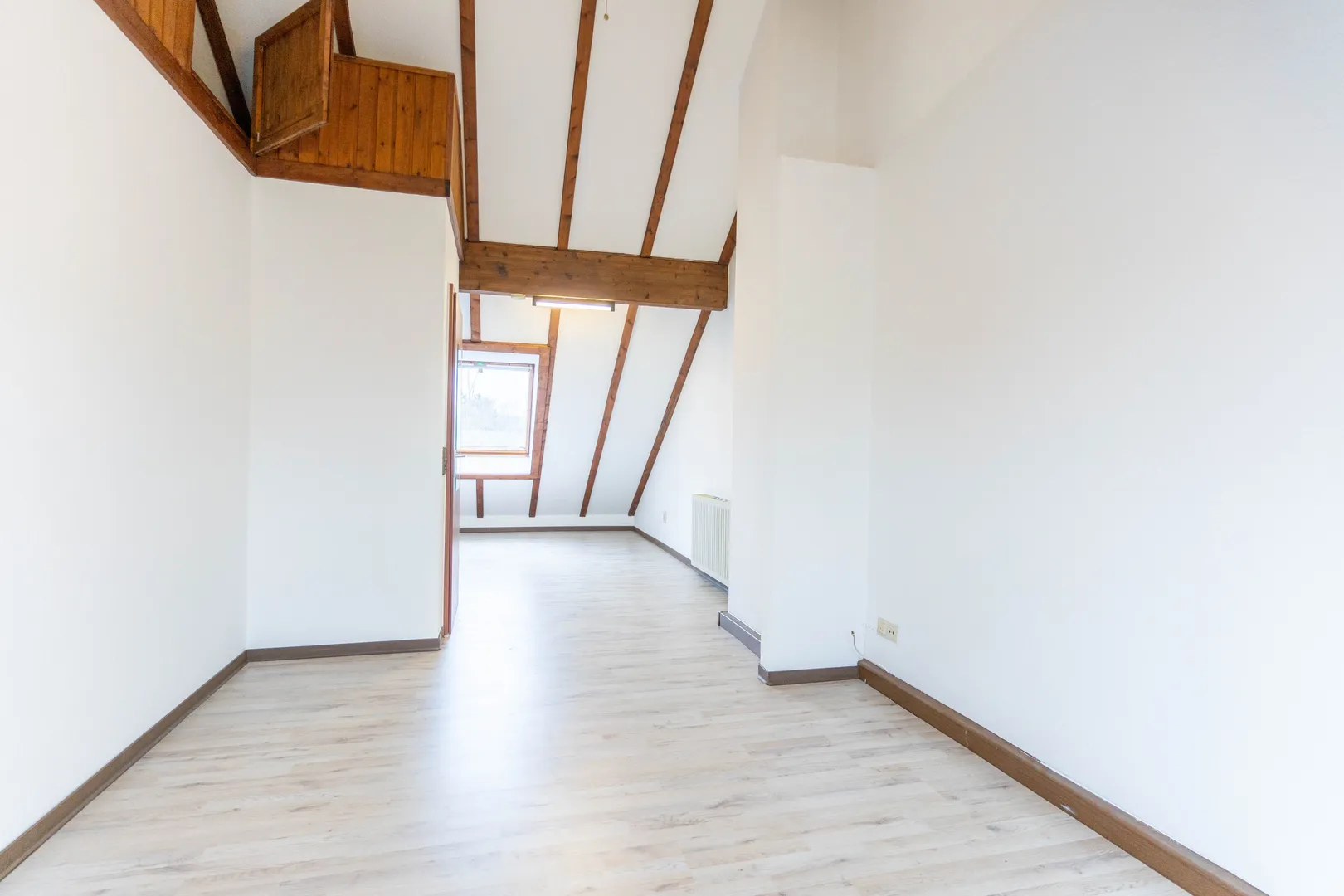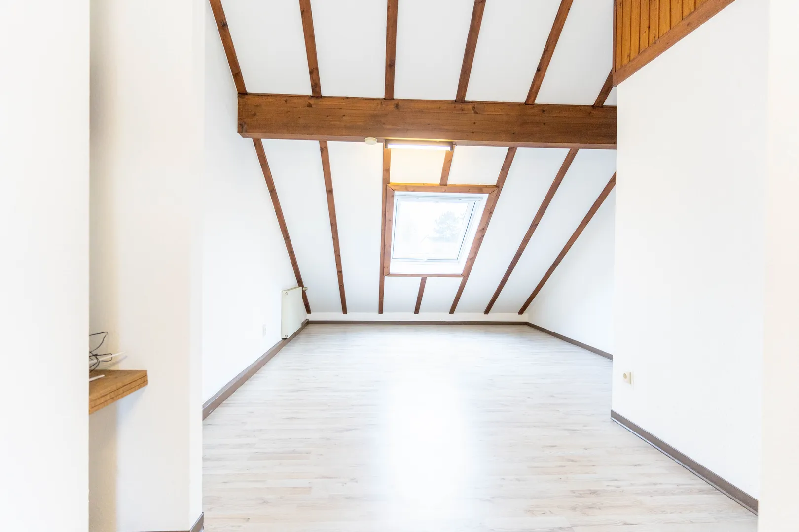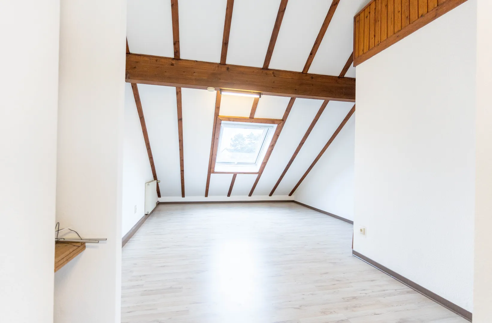 Über eine stilvolle Holztreppe gelangt man ins Obergeschoss, das zwei geräumige Schlafzimmer und ein großes Badezimmer beherbergt. Besonders reizvoll ist das ausgebaute Dachgeschoss, das durch Schrägen mit Dachfenstern und Jalousien eine gemütliche Atmosphäre schafft. Ein Hauch von Fachwerkstil verleiht diesem Bereich besonderen Charme, während zusätzlicher Stauraum für praktische Nutzungsmöglichkeiten sorgt.