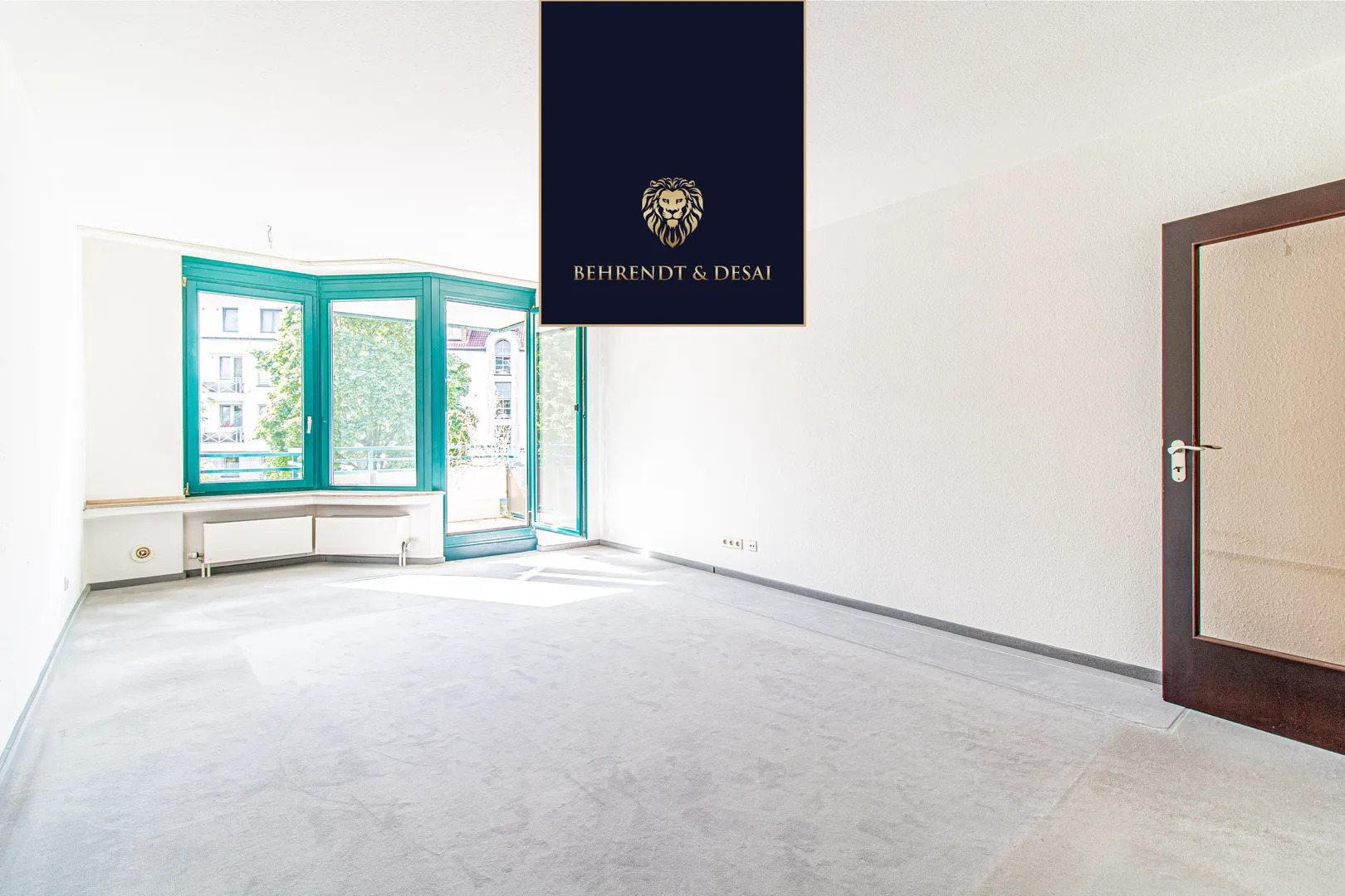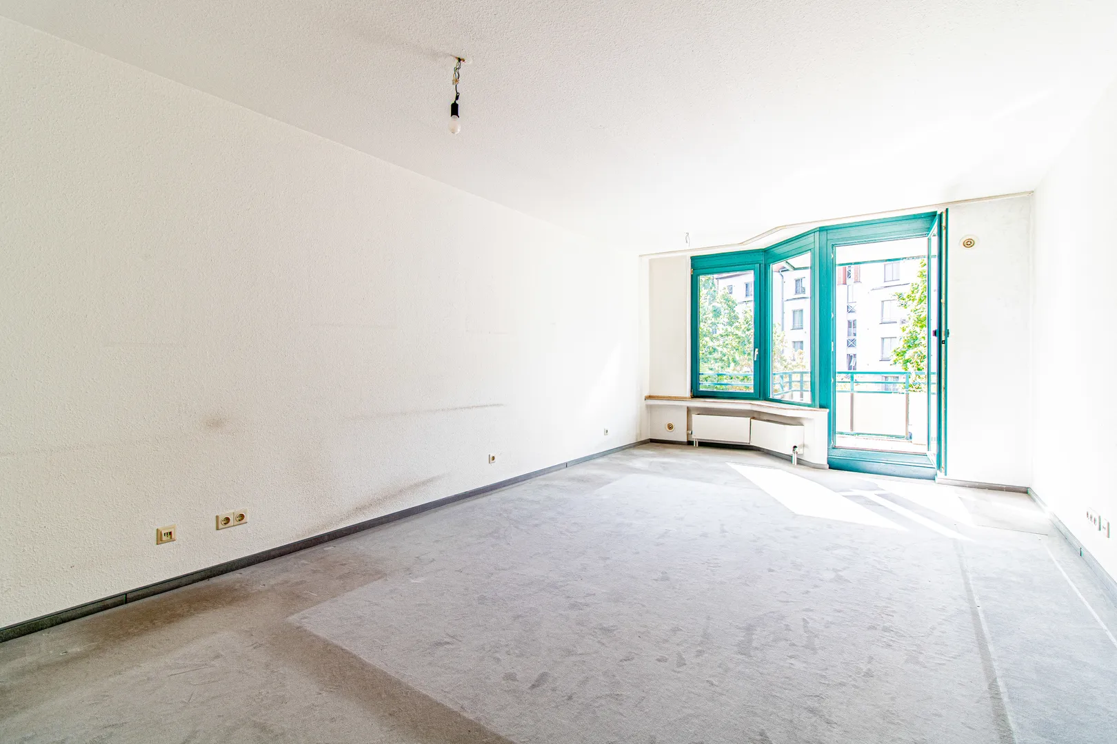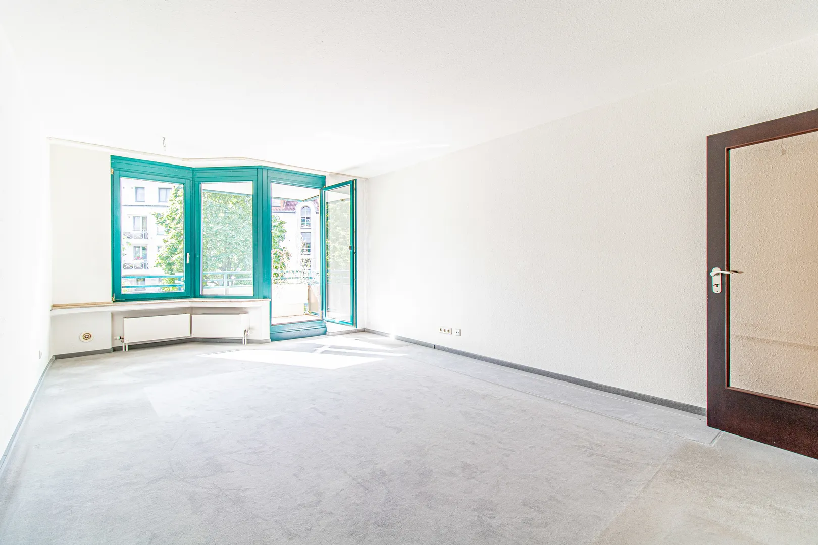 Rechtsseitig vom Eingangsbereich befindet sich der ca. 24 m2 große Wohnraum. Von hier aus haben Sie Zugang zum gemütlichen Süd-West-Balkon. Besonders hervorzuheben sind die türkisen Holzfenster mit 2-fach Isolierverglasung. Diese sorgen für viel Tageslicht im gesamten Wohnbereich.