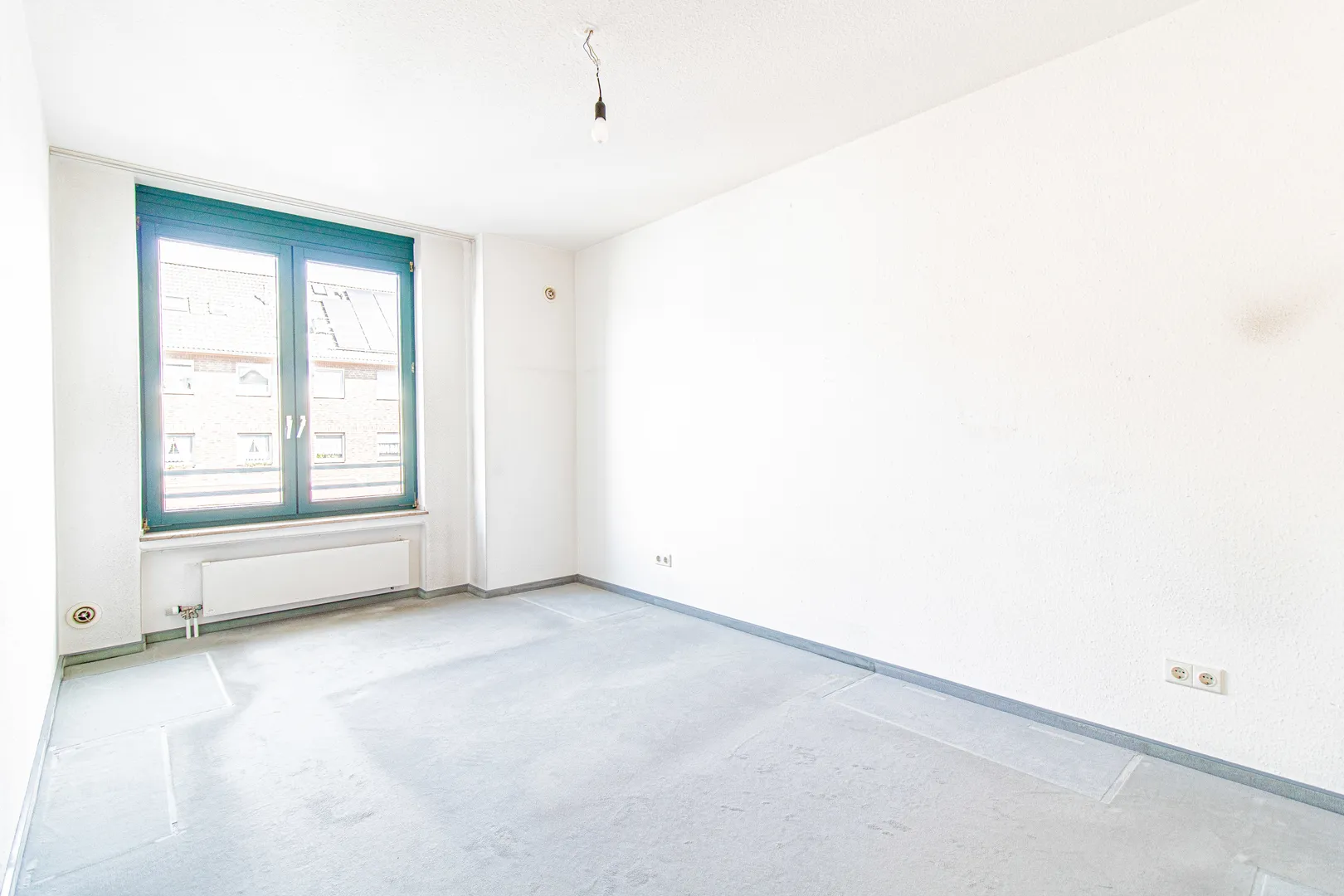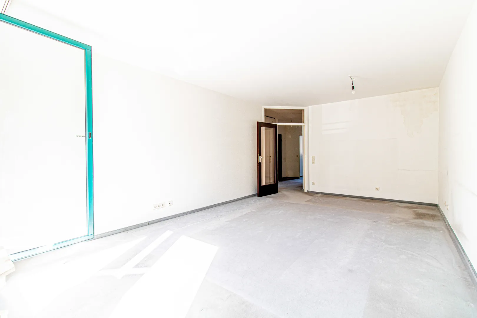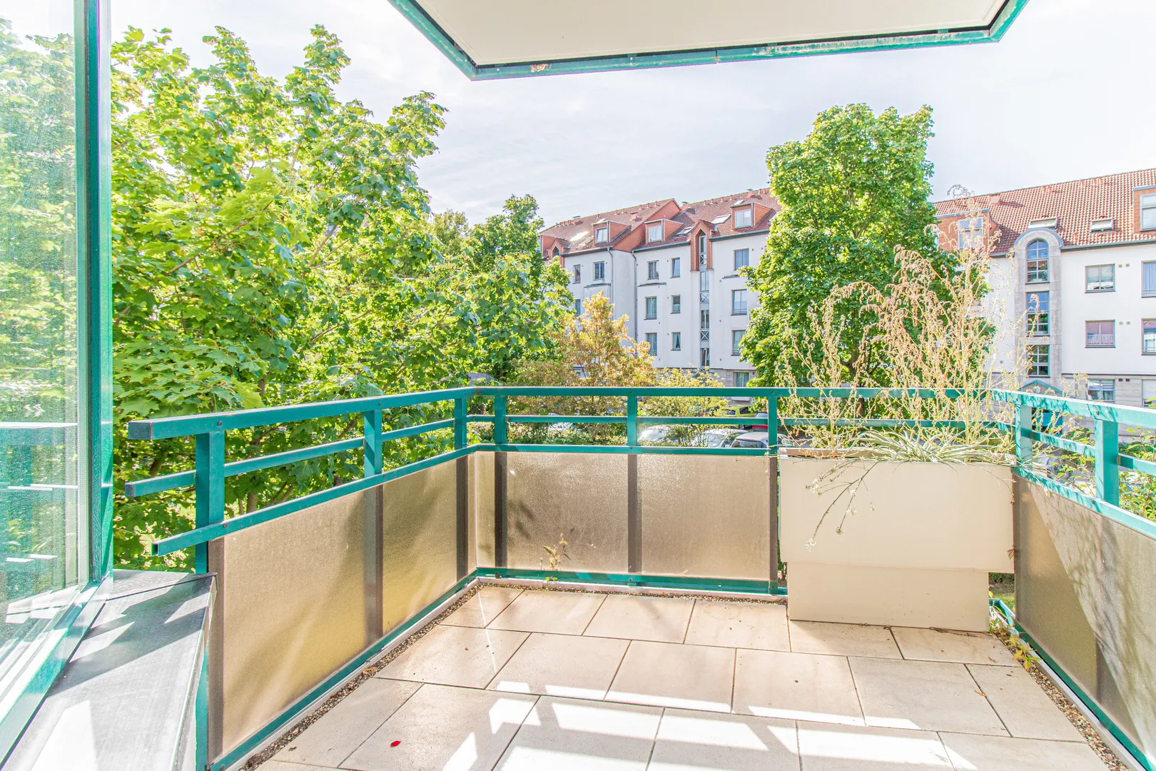 Rechtsseitig vom Eingangsbereich befindet sich der ca. 24 m2 große Wohnraum. Von hier aus haben Sie Zugang zum gemütlichen Süd-West-Balkon. Besonders hervorzuheben sind die türkisen Holzfenster mit 2-fach Isolierverglasung. Diese sorgen für viel Tageslicht im gesamten Wohnbereich.