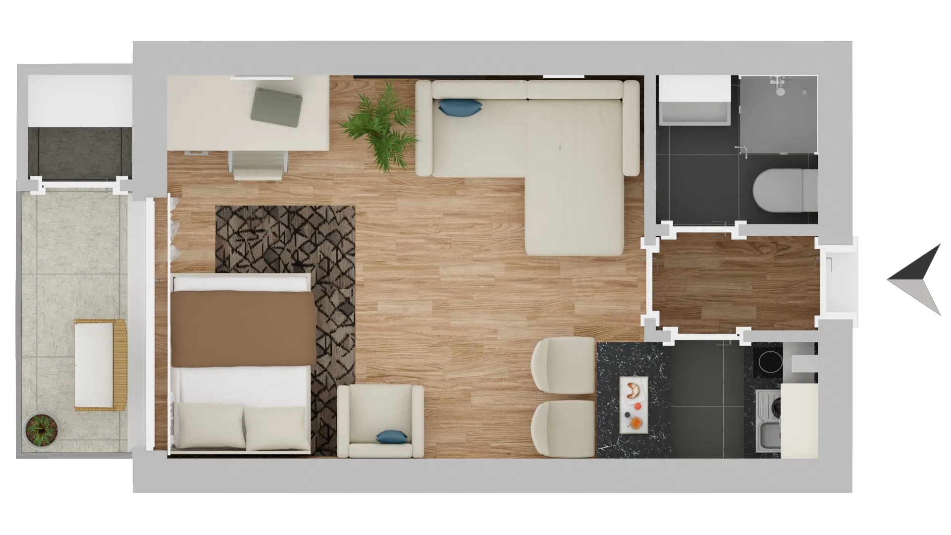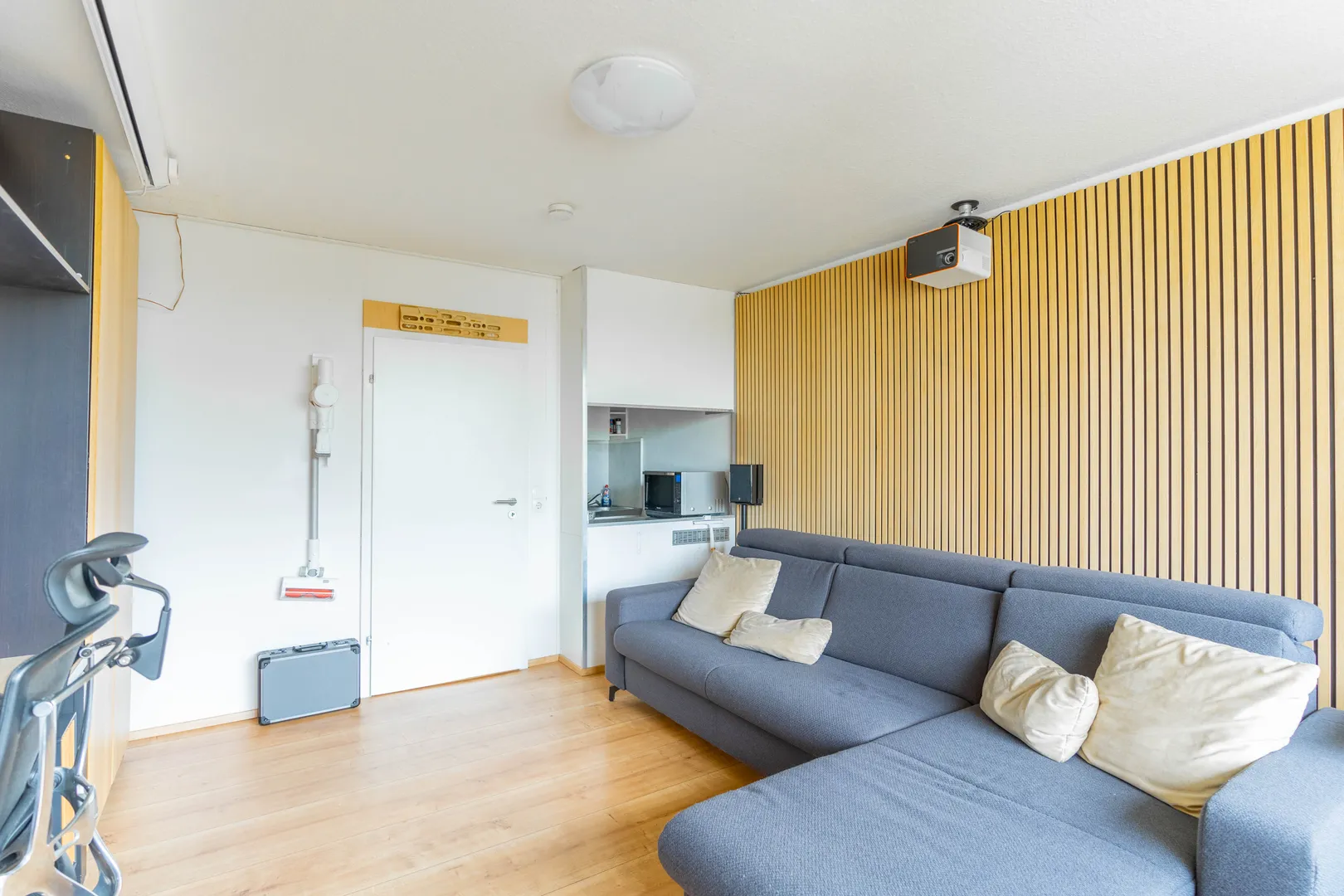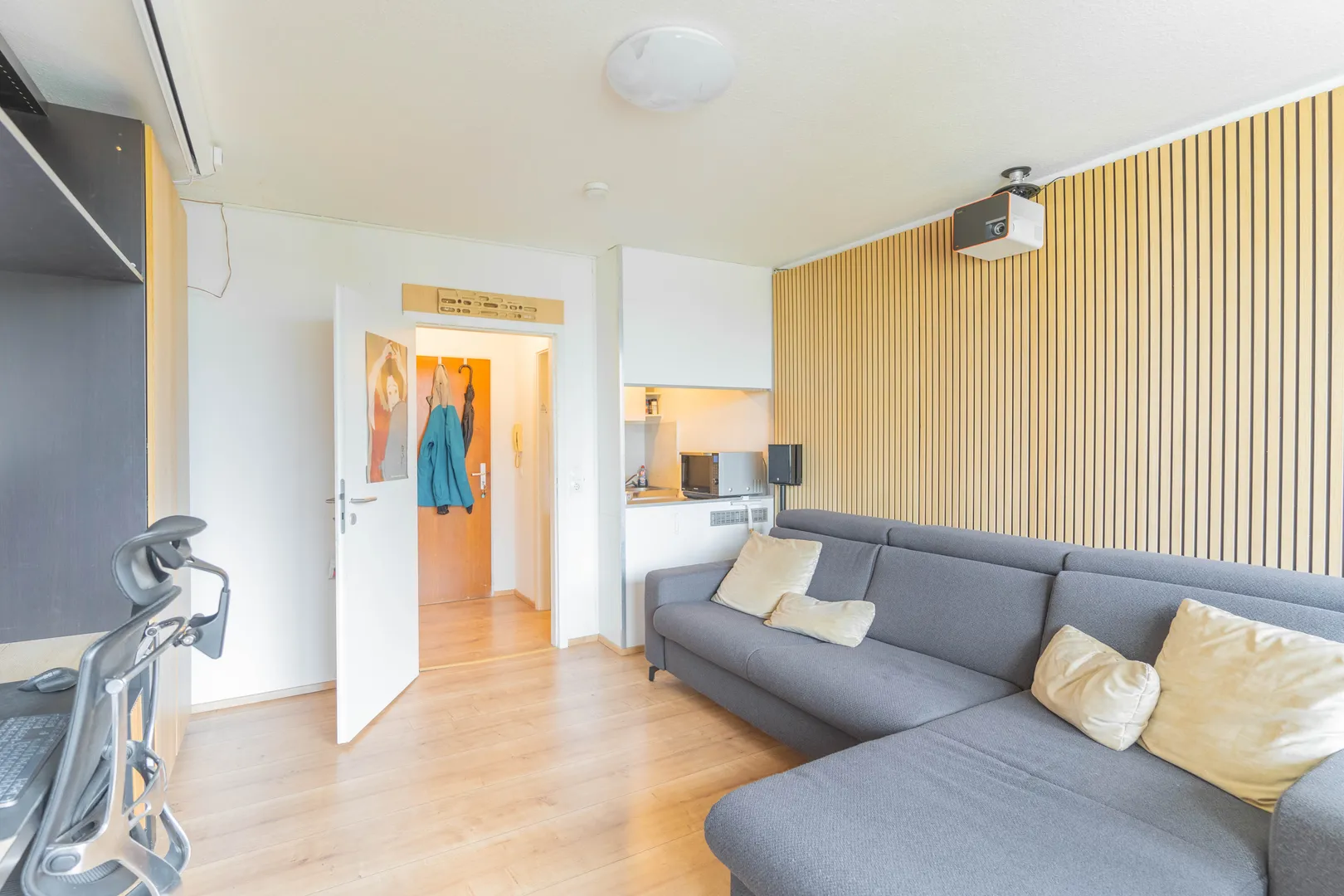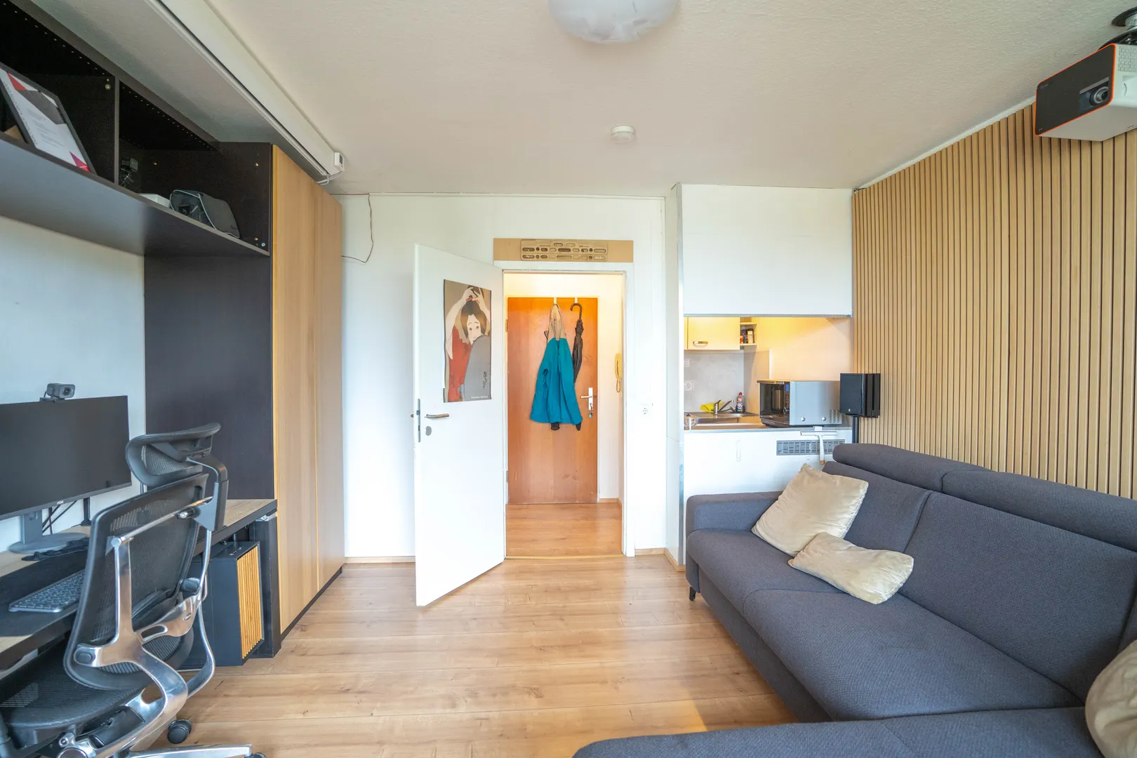 Dank der großen Fensterflächen wird der gesamte Wohnbereich mit reichlich Tageslicht durchflutet. Der Wohn-/Essbereich bietet ausreichend Platz für einen Kleiderschrank und ein Bett, und lädt zum Verweilen ein.