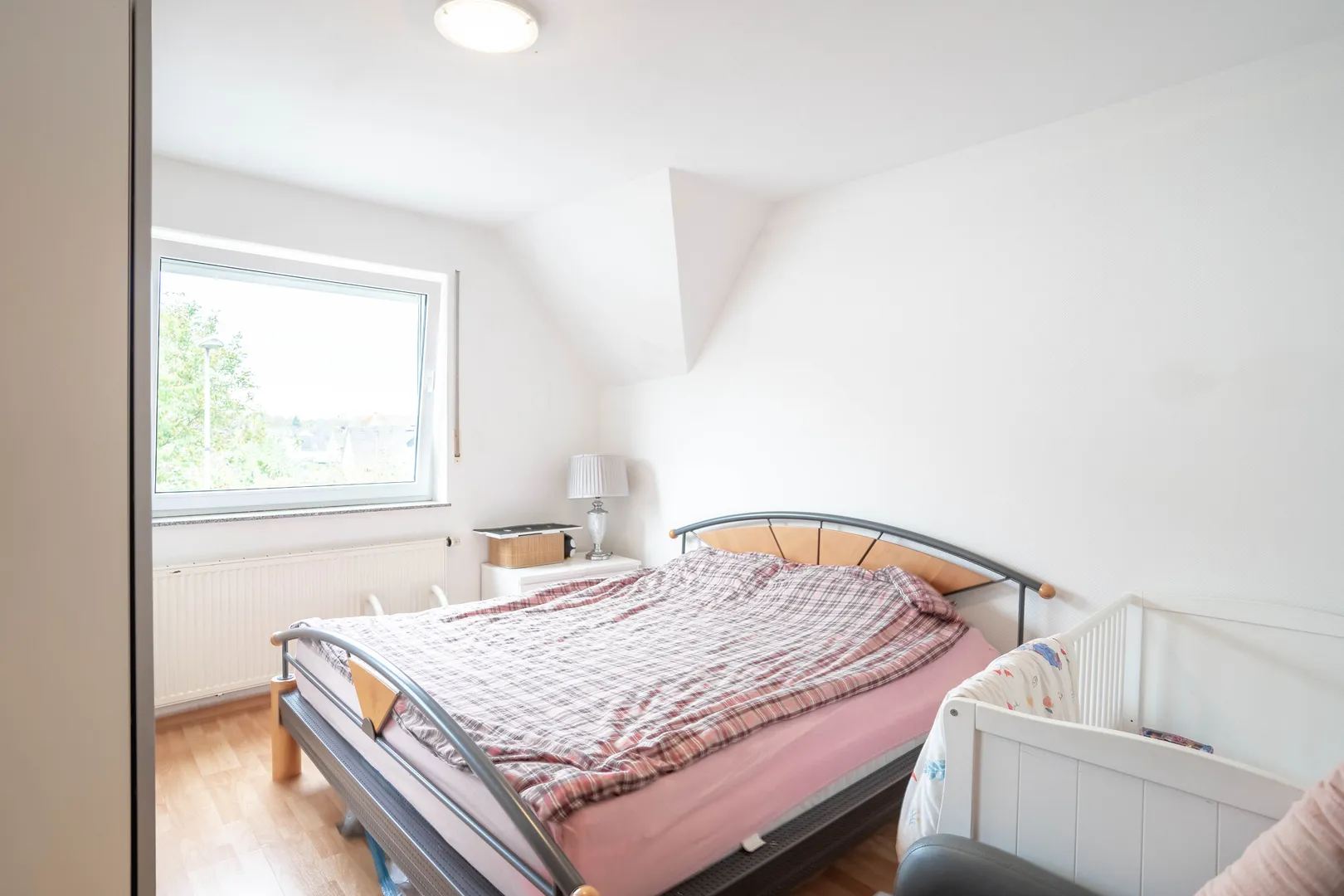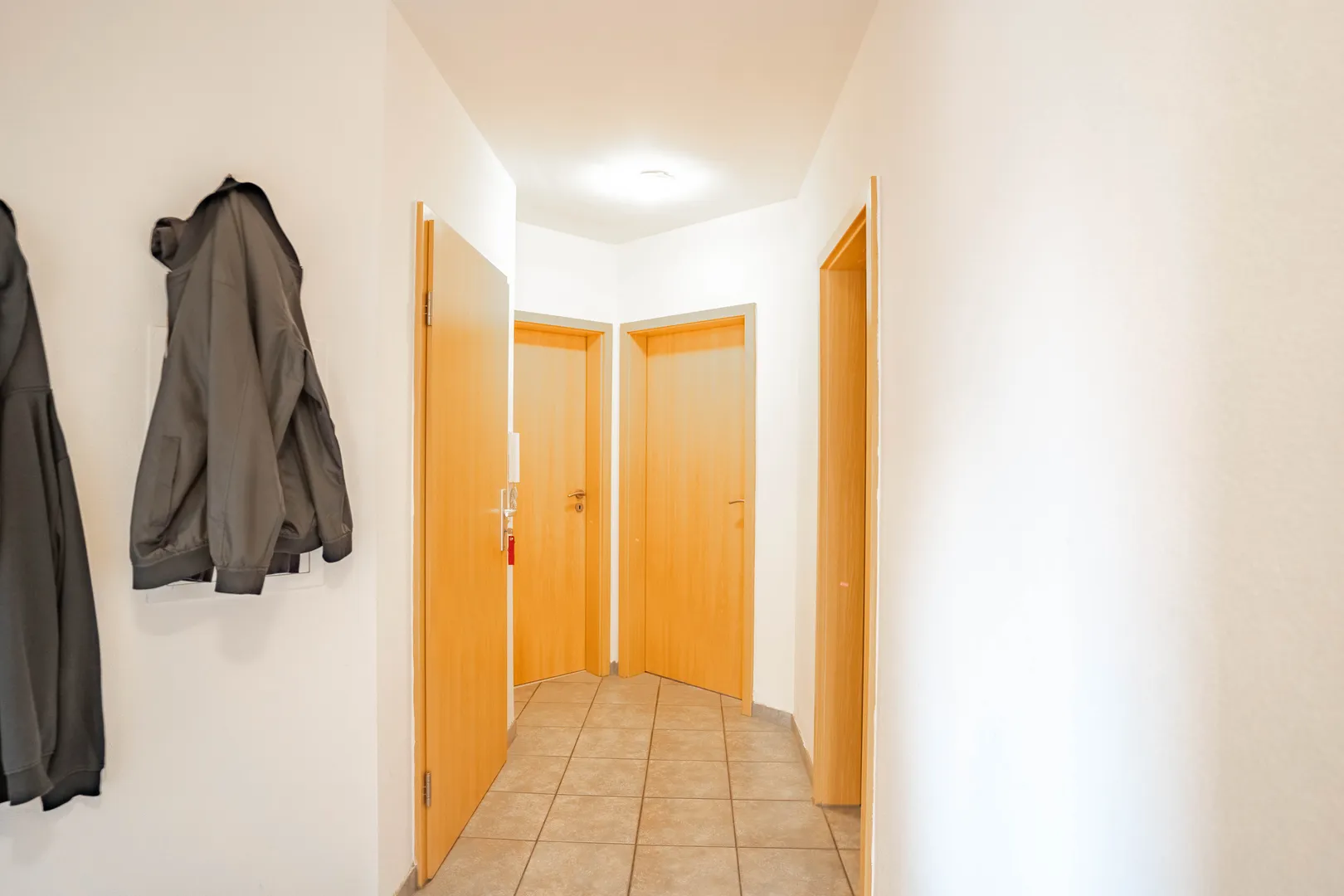 Diese attraktive Wohnung im ersten Obergeschoss besticht durch ihren durchdachten Grundriss und ein modernes Ambiente. Beim Betreten werden Sie von einem geräumigen Flur mit pflegeleichtem Fliesenboden empfangen, der einen einladenden ersten Eindruck vermittelt.Links befinden sich zwei lichtdurchflutete Zimmer: eines eignet sich perfekt als Kinderzimmer oder Home Office, während das andere als gemütliches Schlafzimmer genutzt werden kann. Beide Räume sind mit großzügigen Fenstern und hochwertigem Laminat ausgestattet, die eine angenehme und helle Atmosphäre schaffen.