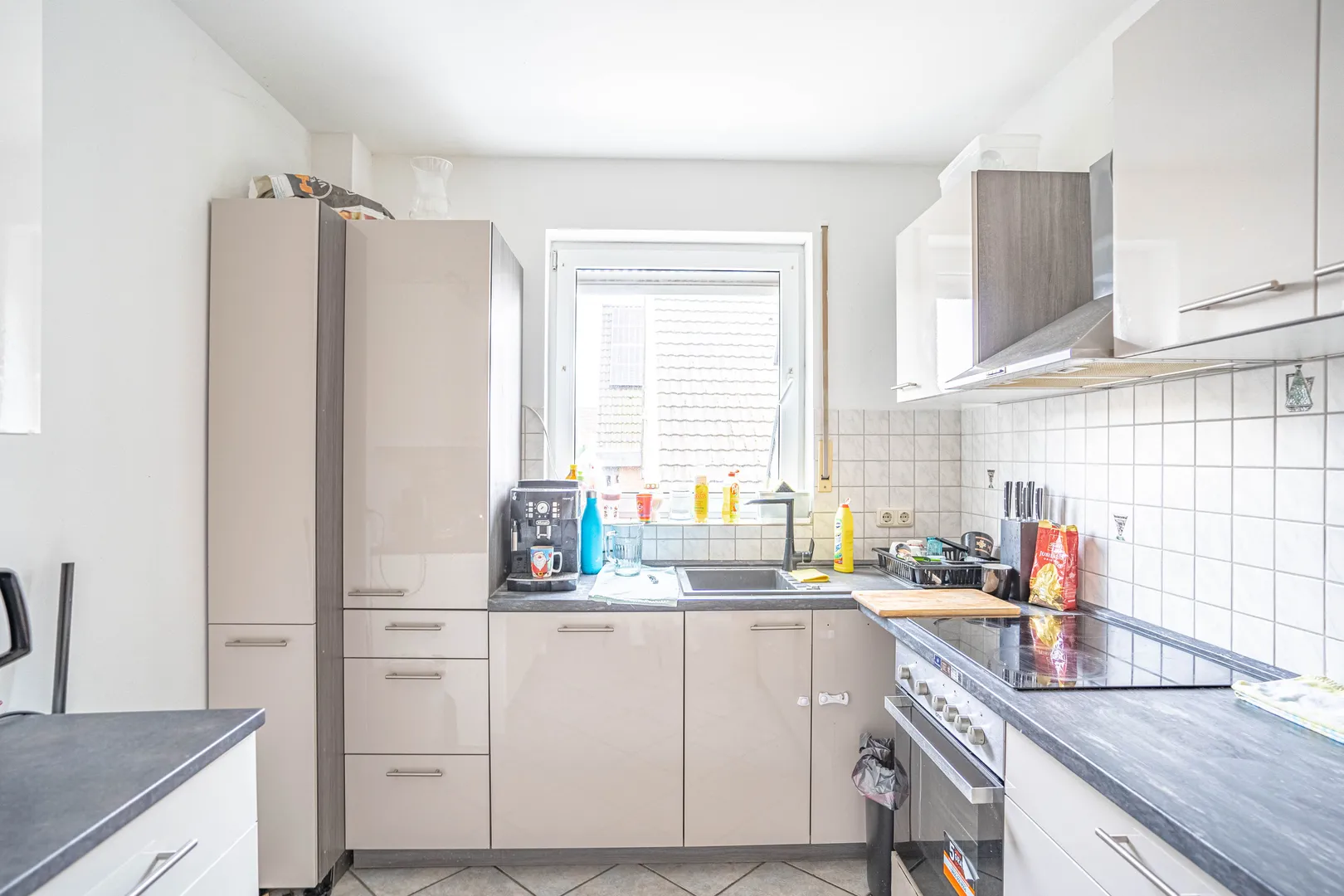 Rechts gelangen Sie in die moderne Küche, die in stilvollem Anthrazit mit eleganten Holzoptik-Oberflächen gestaltet ist. Sie bietet reichlich Stauraum und ist ebenfalls mit einem pflegeleichten Fliesenboden versehen – ideal für das kreative Kochen. Die Küche kann gerne übernommen werden, sodass Sie direkt mit der Zubereitung Ihrer Lieblingsgerichte loslegen können.