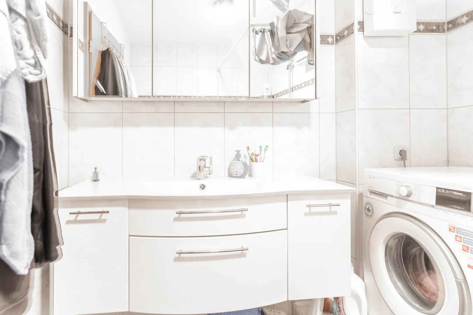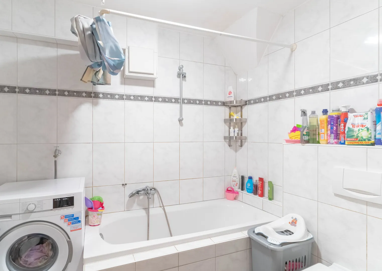 Das helle Badezimmer ist mit einer Badewanne und einem großen, modernen Waschtisch ausgestattet, der zusätzlichen Komfort bietet und einladend wirkt.