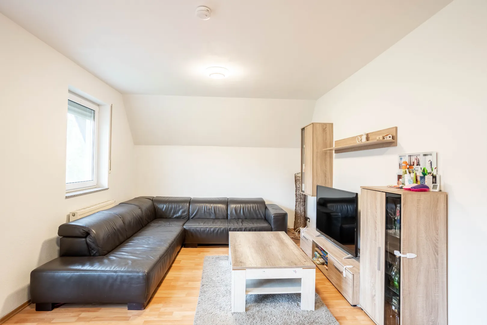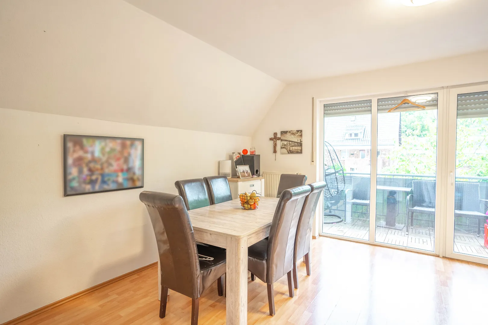 Das Wohnzimmer ist das Herzstück der Wohnung. Hier erwartet Sie ein stilvoller Laminatboden und ein angrenzender Balkon. Sie finden ausreichend Platz für eine einladende Sofaecke sowie einen komfortablen Essbereich, ideal für gesellige Abende. Die große Fensterfront lässt viel Tageslicht herein und öffnet den Raum zum Grünen. Der Balkon ist großzügig gestaltet und bietet ausreichend Platz für eine kleine Tischgarnitur und einen Grill – perfekt für entspannte Sommerabende im Freien.