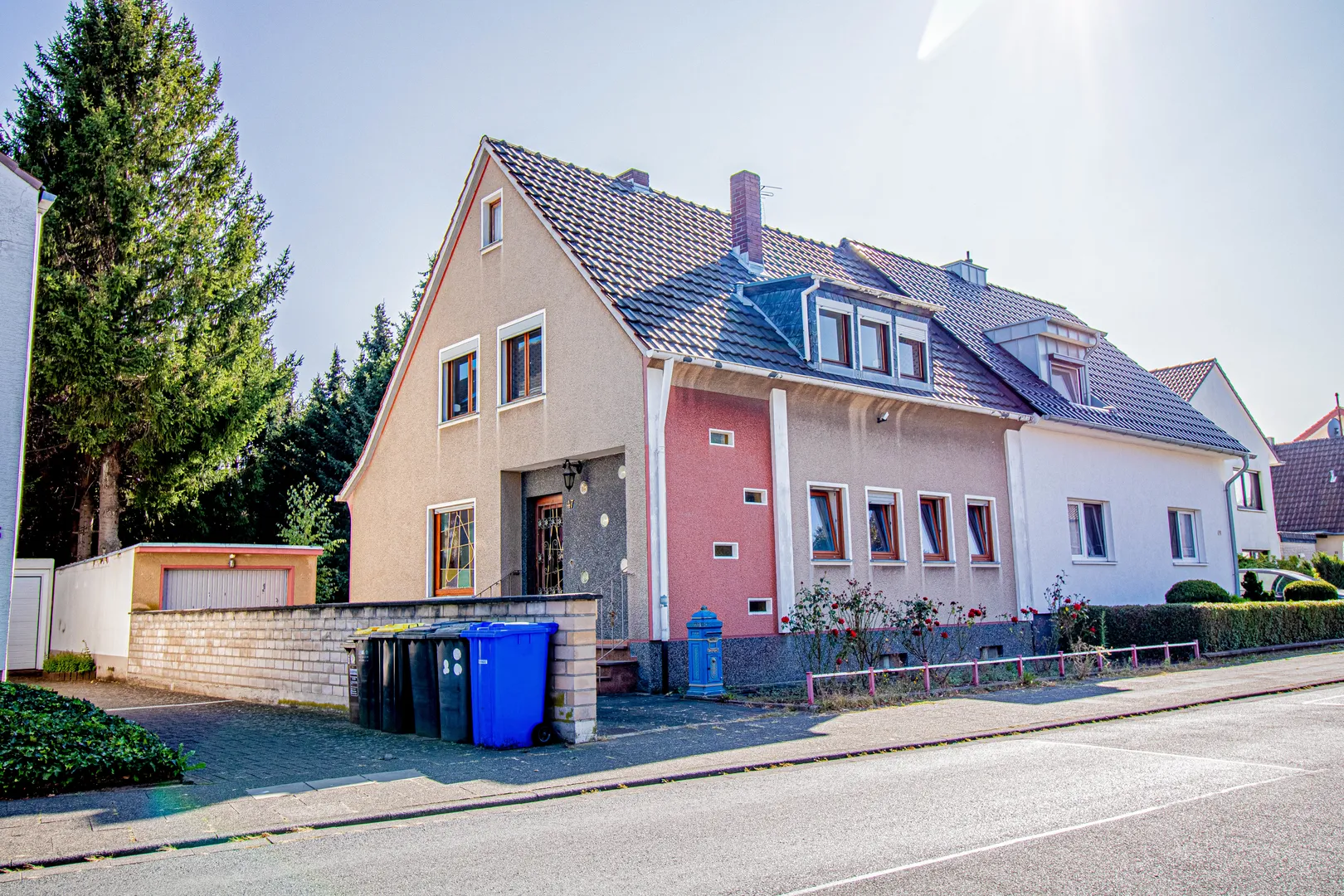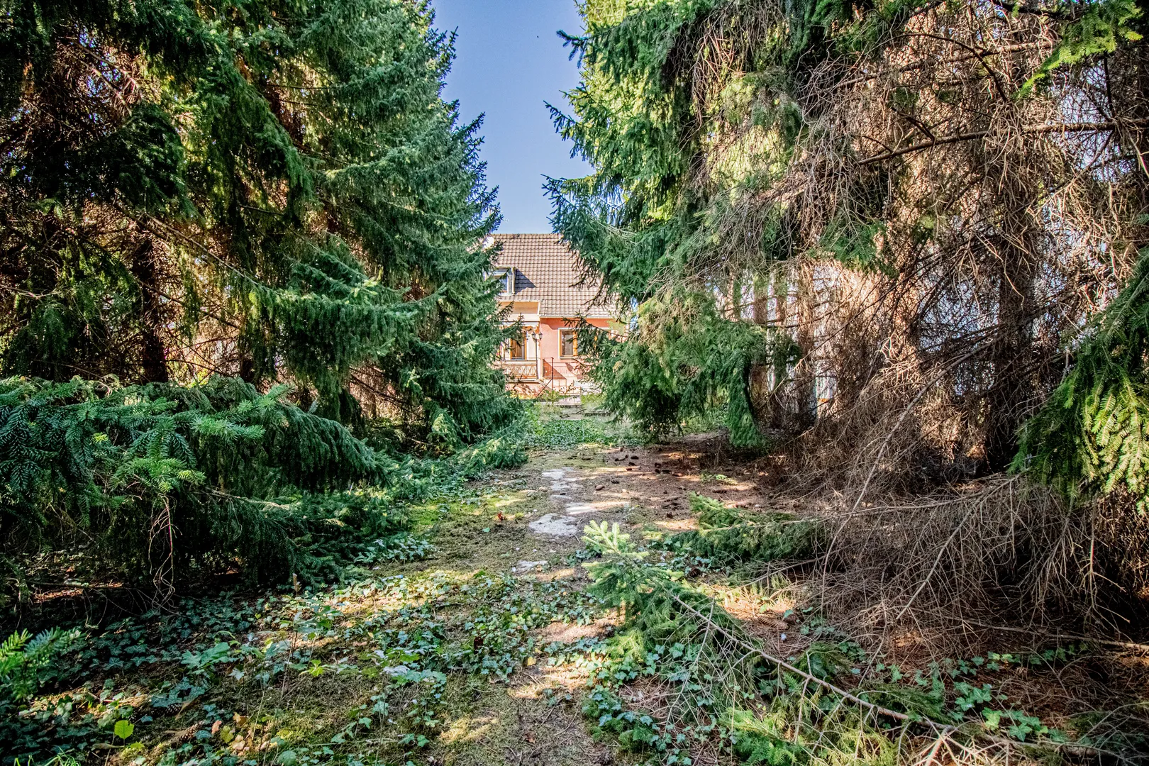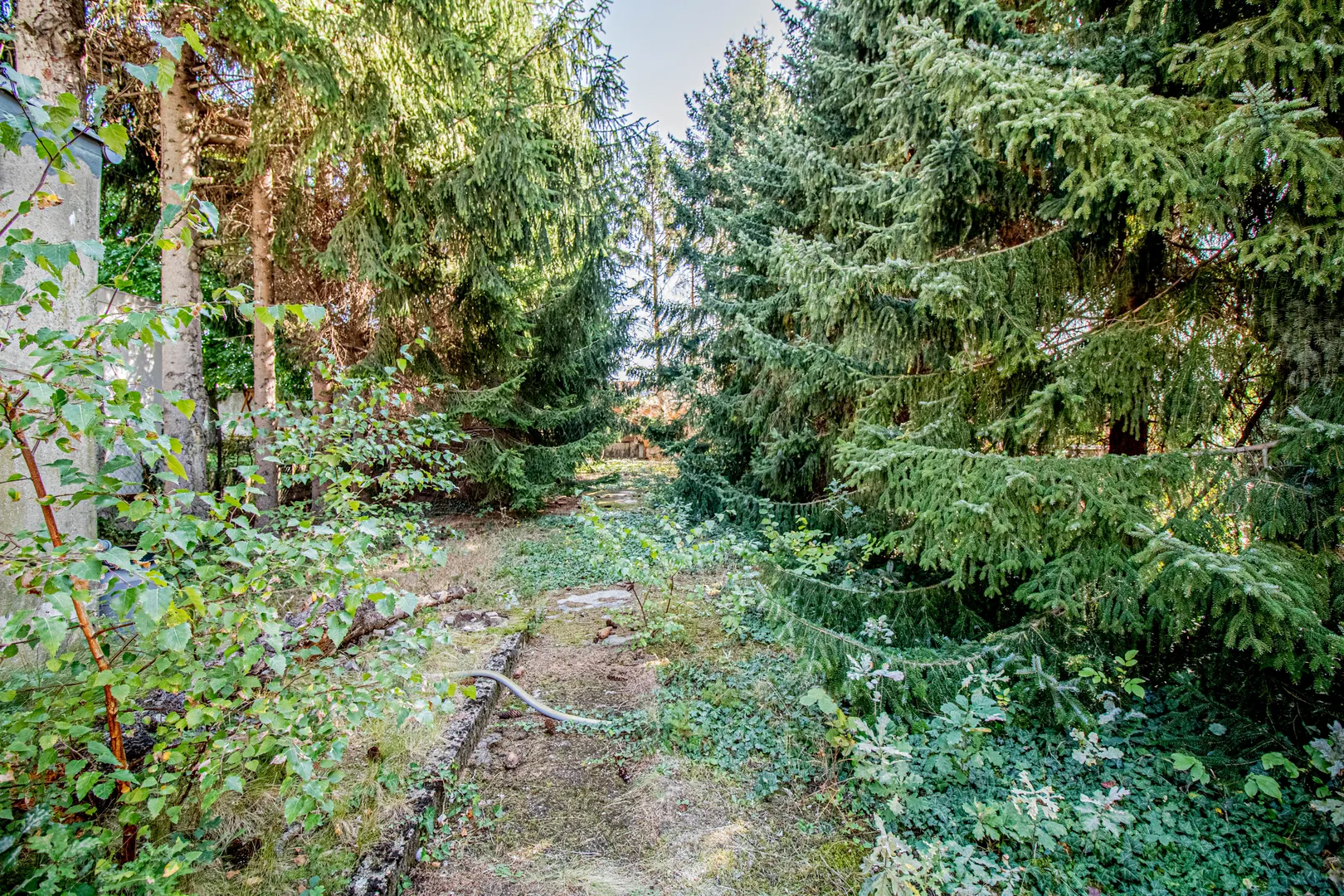 Die abgebildeten Tannen mit Stumpf, werden zeitnah entfernt, sodass Sie einen ebenen, großflächigen Garten vorfinden. Eine Garage sowie weitere Stellplätze befinden sich direkt neben dem Haus.