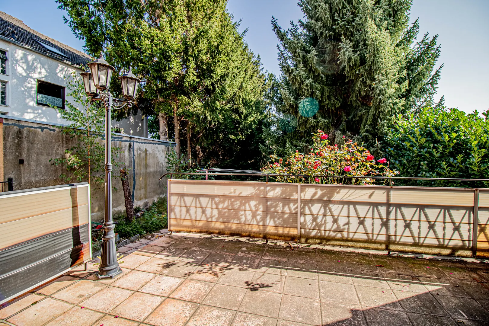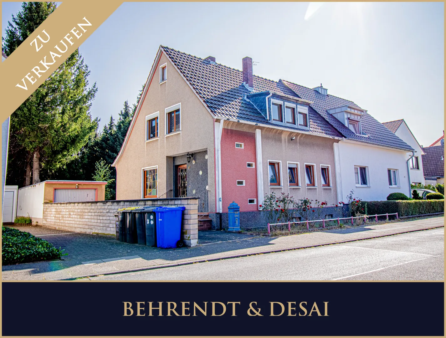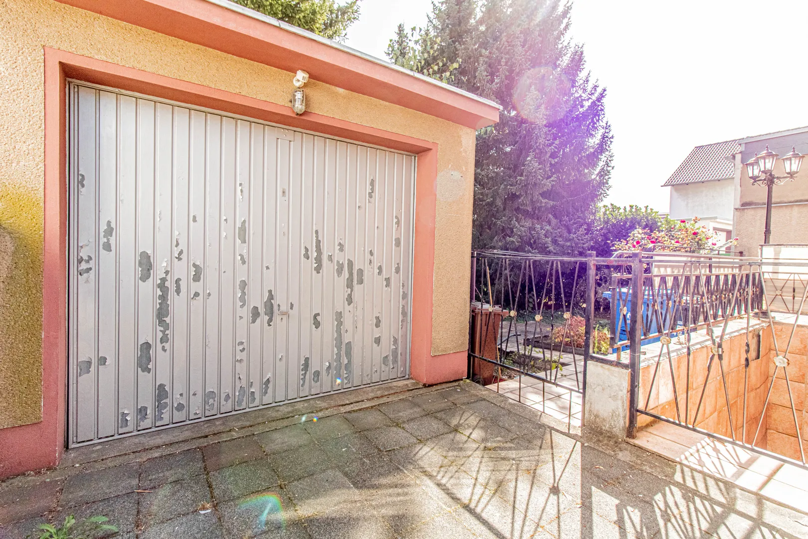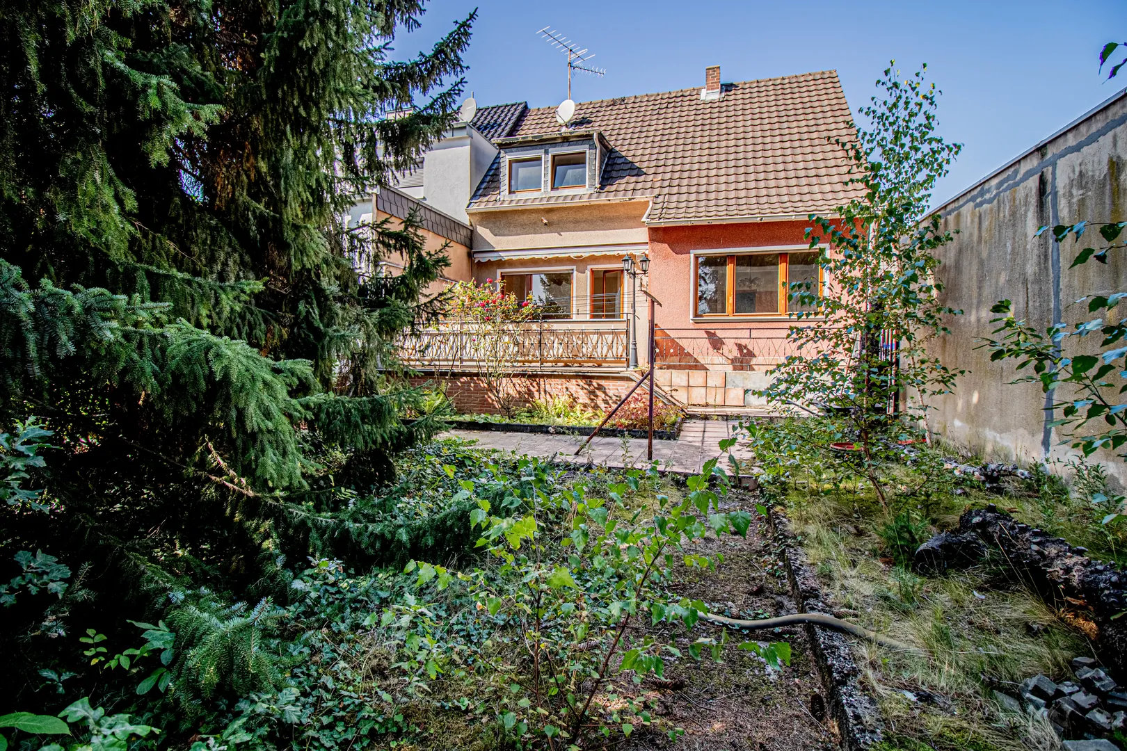 Die abgebildeten Tannen mit Stumpf, werden zeitnah entfernt, sodass Sie einen ebenen, großflächigen Garten vorfinden. Eine Garage sowie weitere Stellplätze befinden sich direkt neben dem Haus.