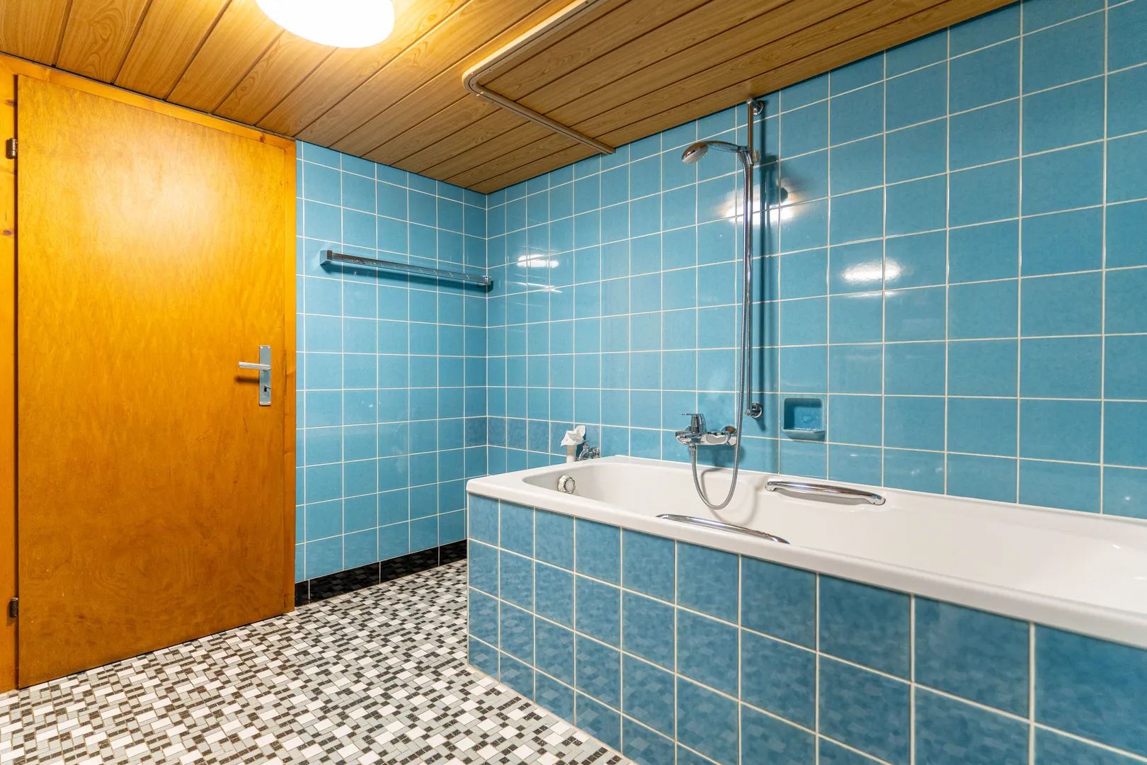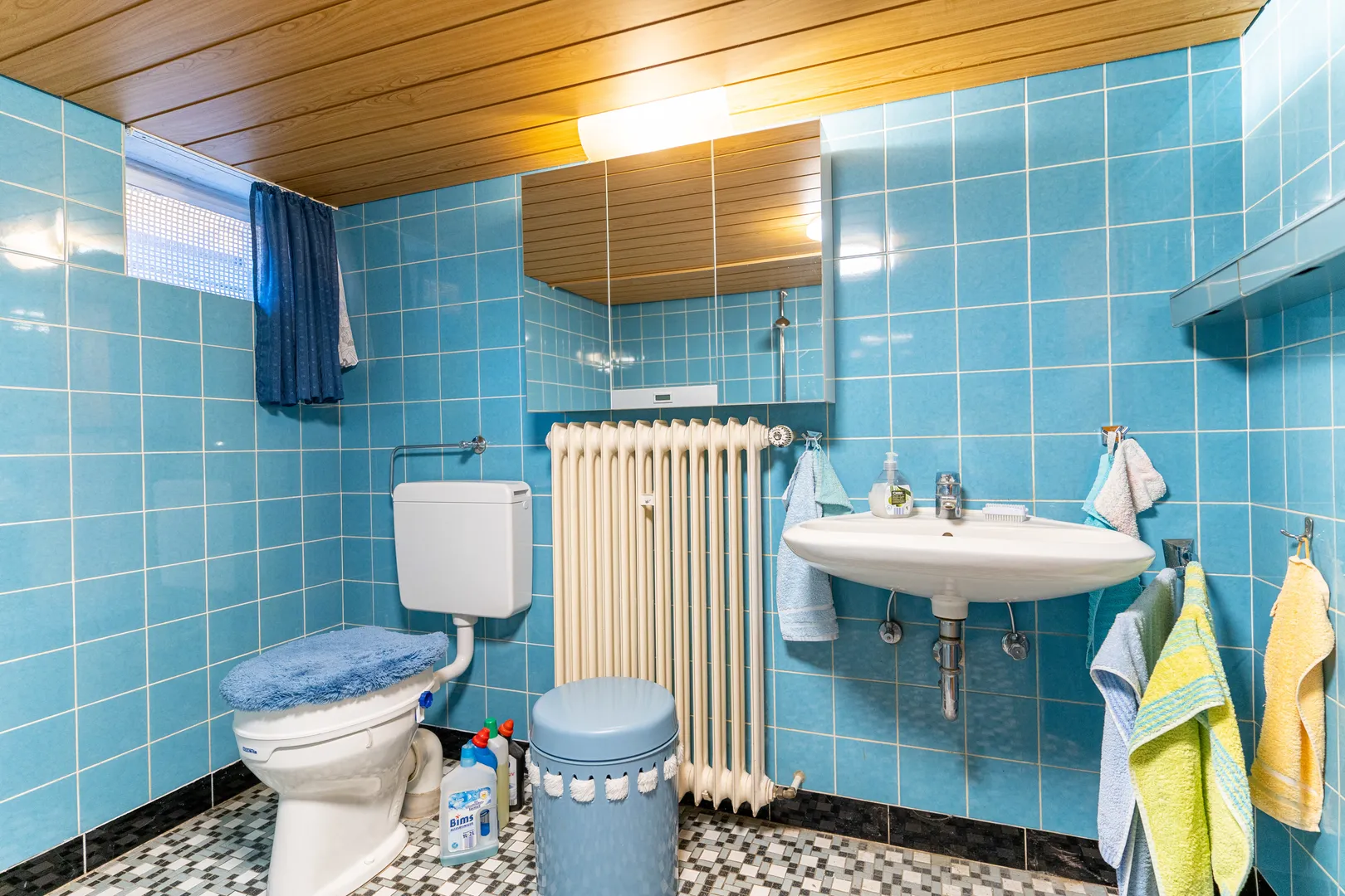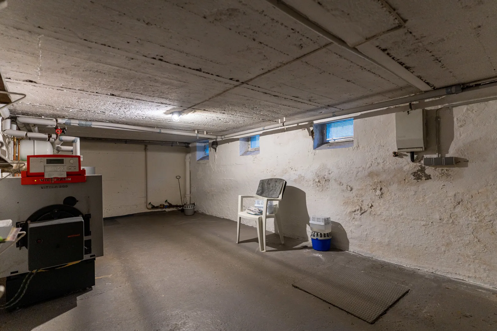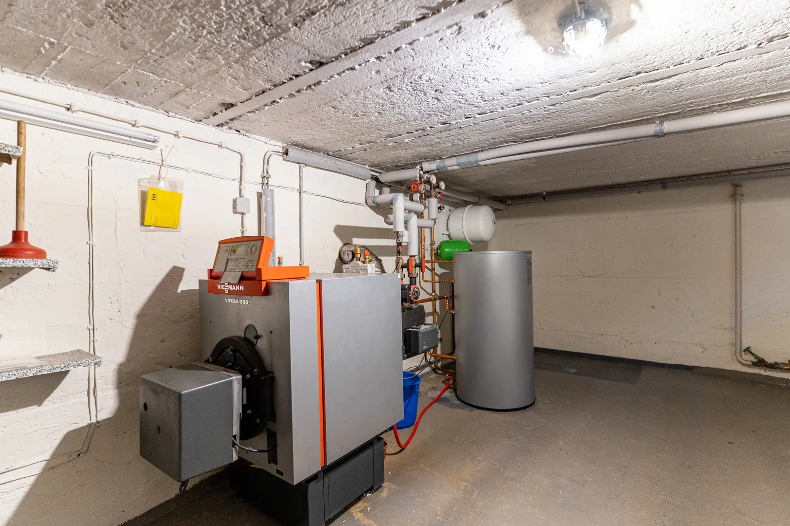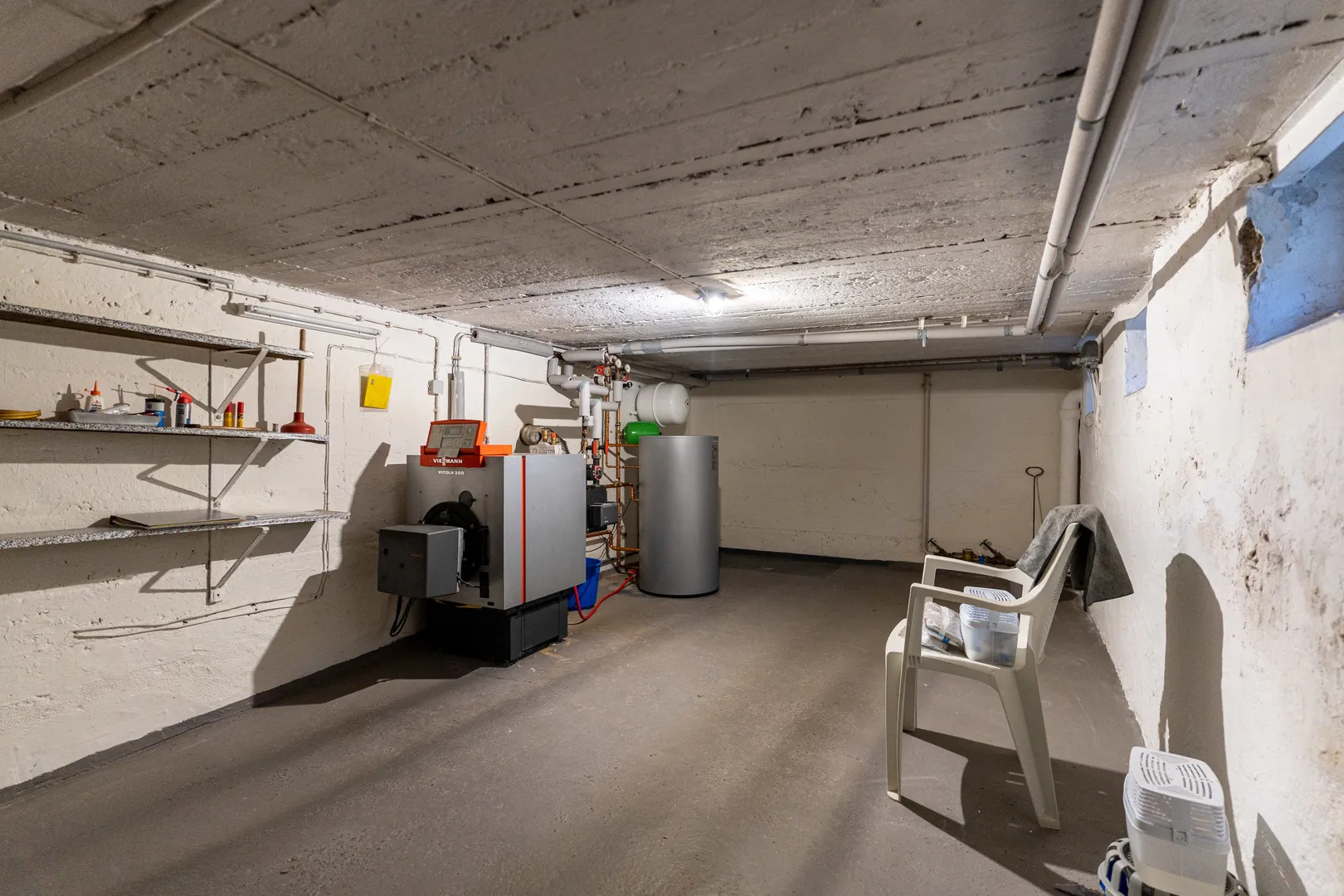 Badezimmer, Technikraum für die Öl-Zentralheizung und ein Raum für die Öltanks befinden sich im Kellergeschoss. Aktuell sind die Wände im Technikraum feucht.