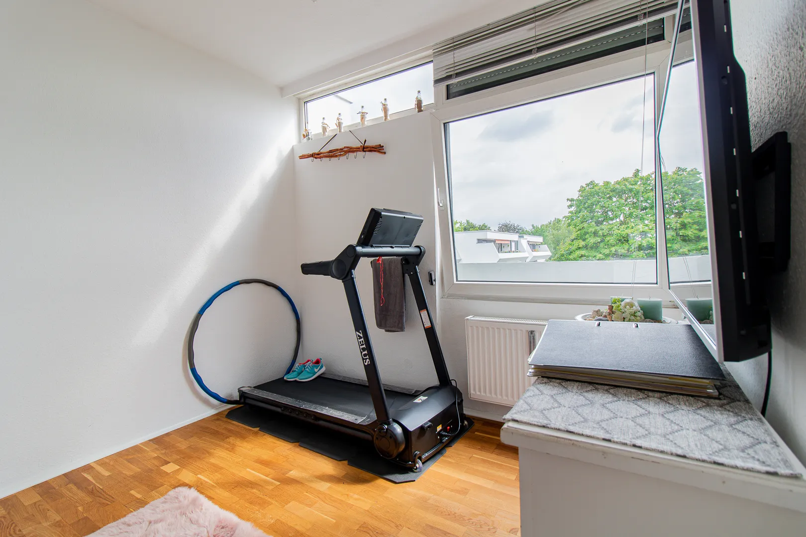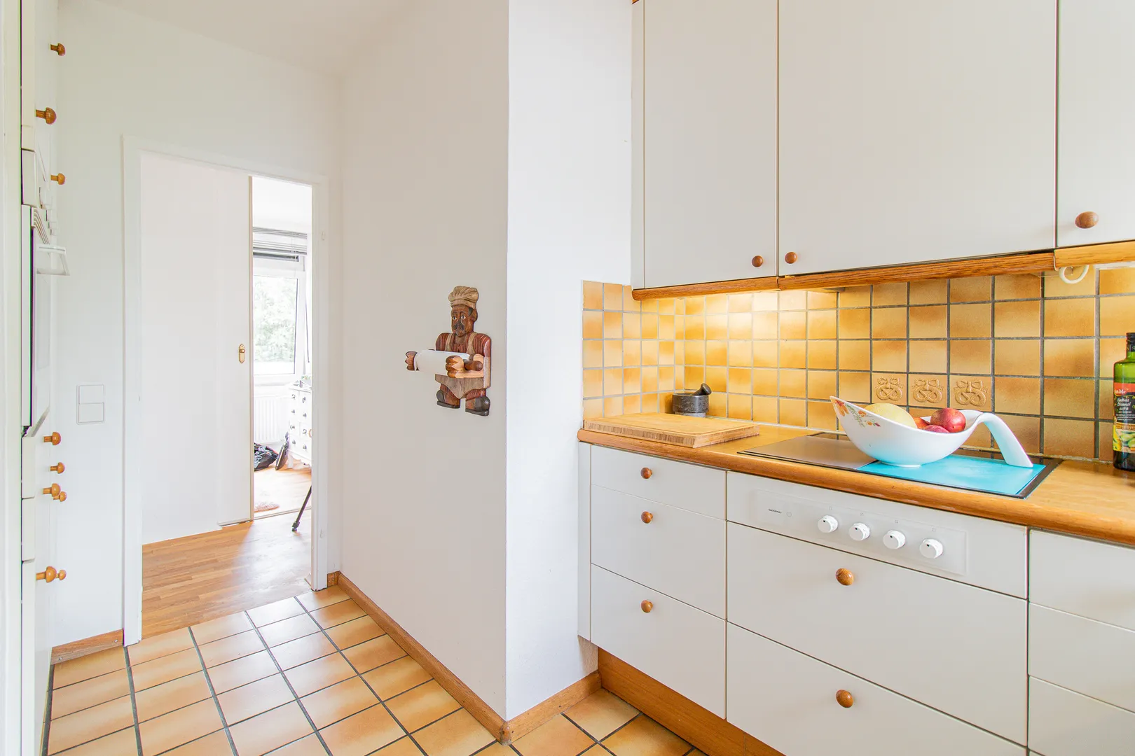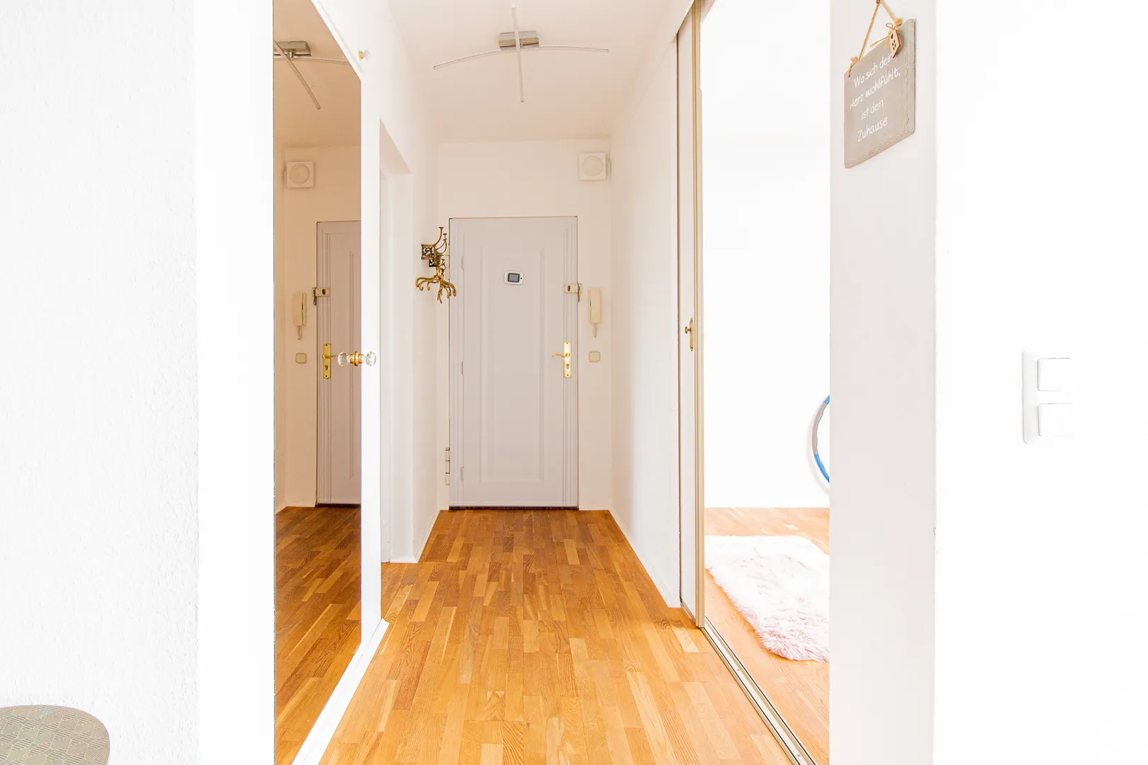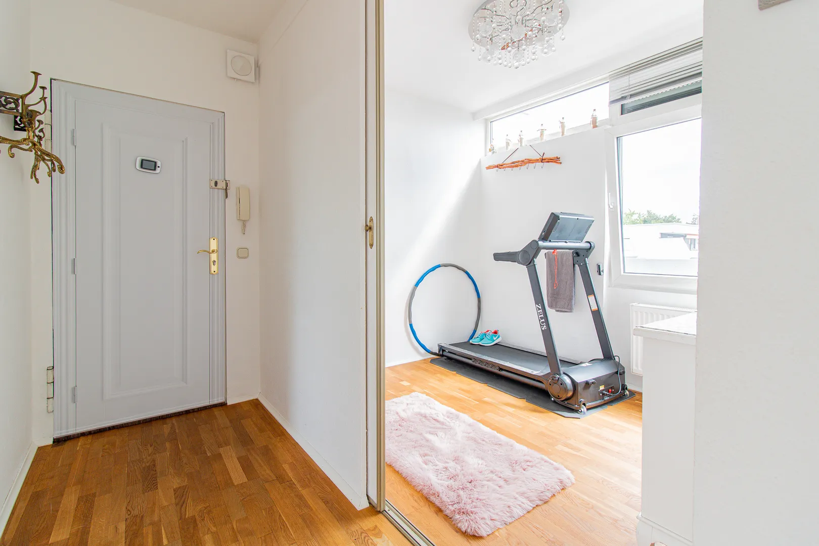 Vom Eingangsbereich finden Sie linksseitig das Fitnesszimmer, welches sich mithilfe einer Schiebetüre verschließen lässt. Rechtsseitig befindet sich die geräumige Küche inkl. Elektrogeräten, die gerne kostenfrei übernommen werden kann.