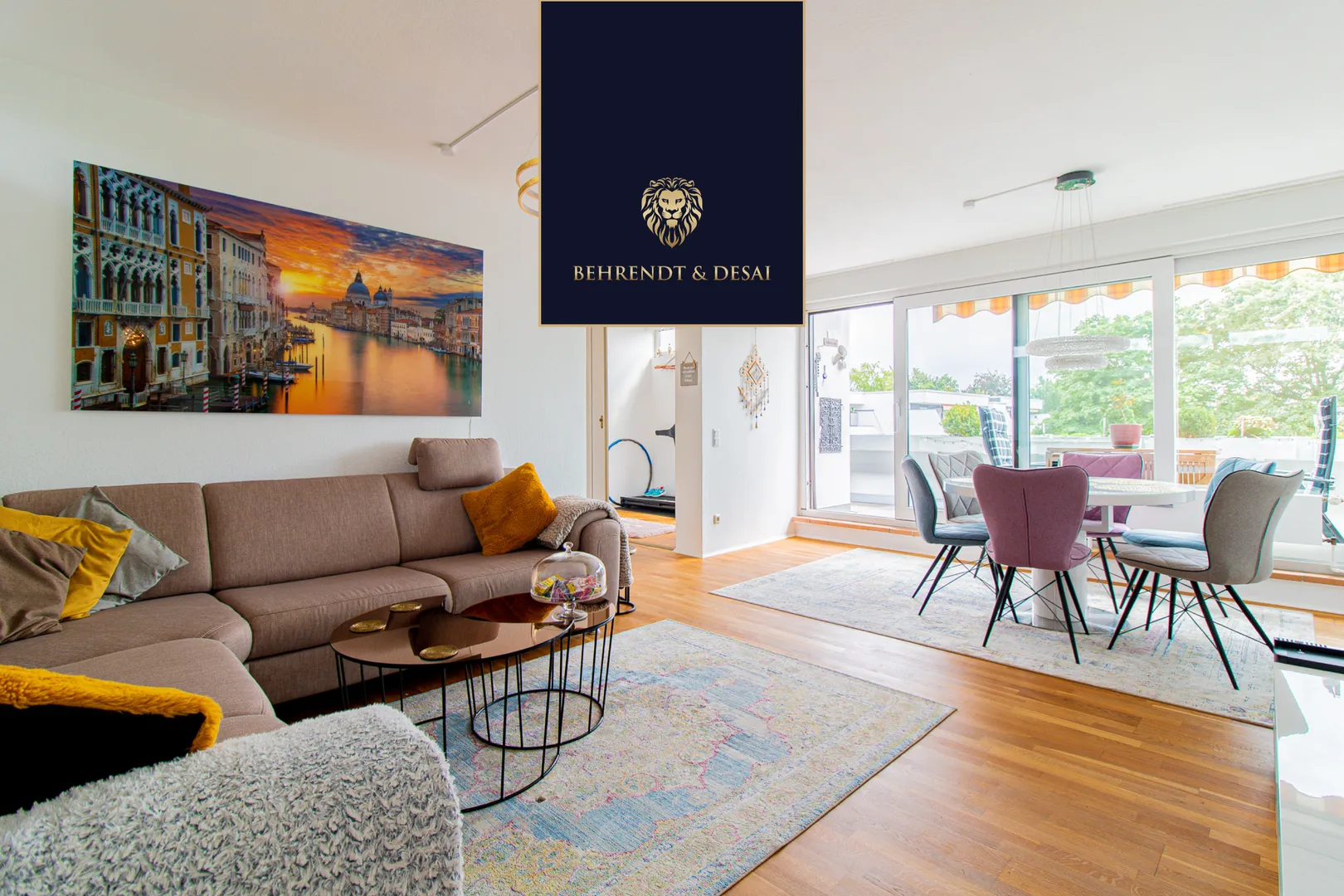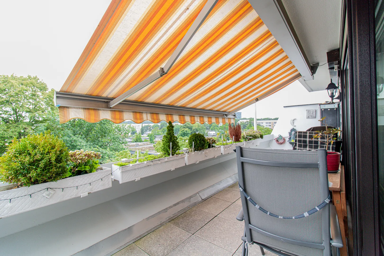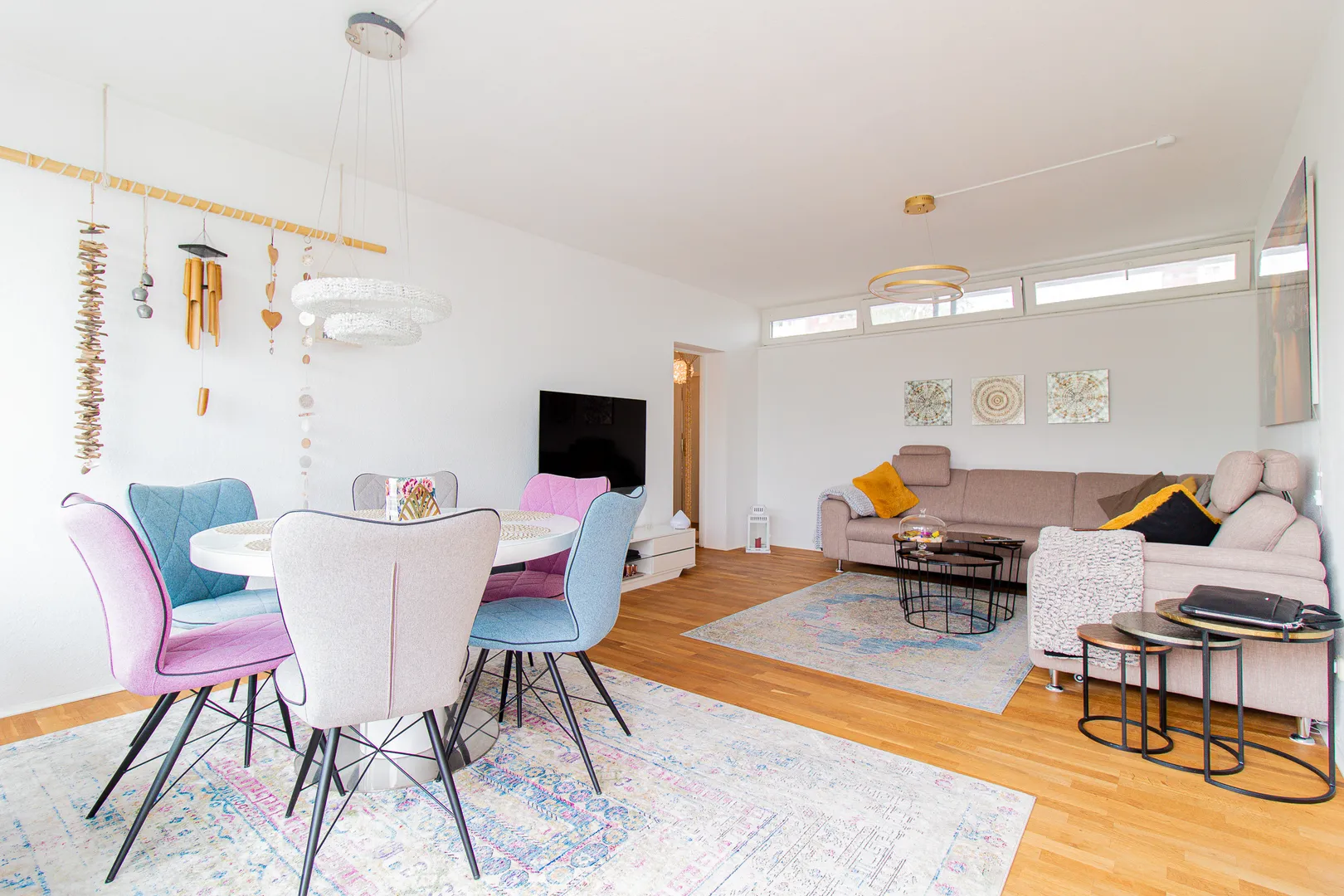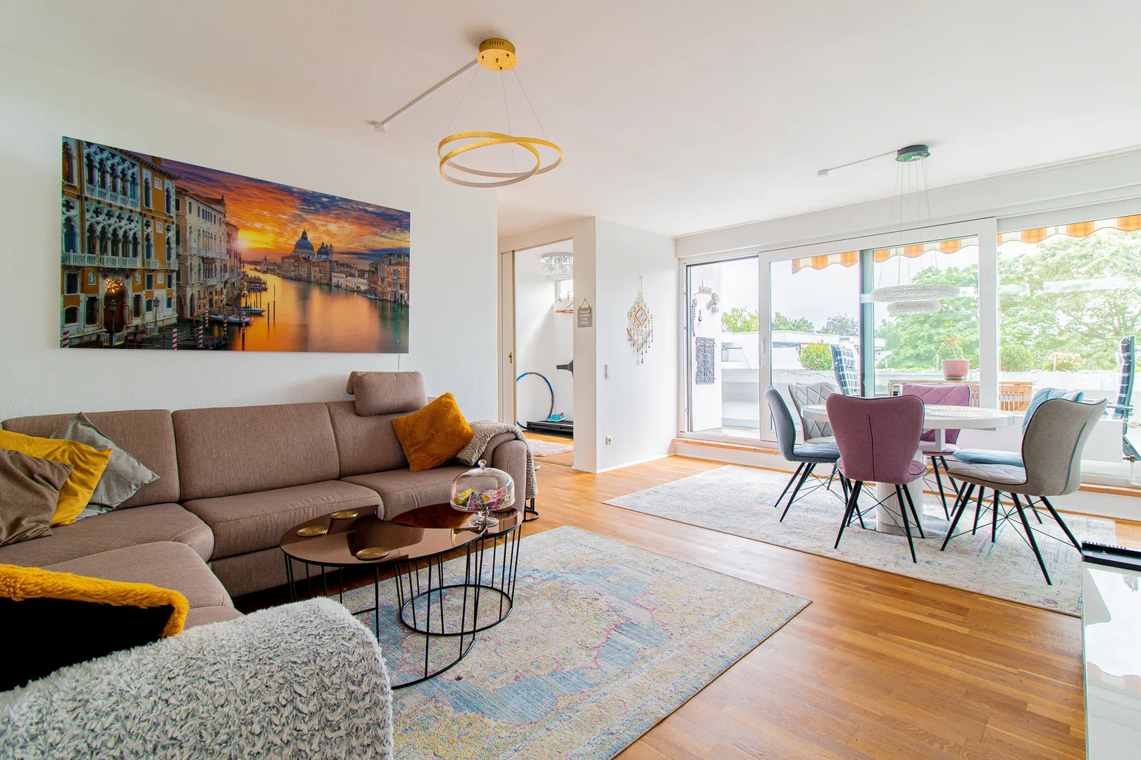 Im Zentrum der Wohnung, befindet sich der Wohn- / Essbereich mit Zugang zur großen Südterrasse mit Markise. Besonders hervorzuheben sind die bodentiefen Holzfenster mit 2-fach Isolierverglasung. Diese sorgen für viel Tageslicht in der gesamten Wohnung.