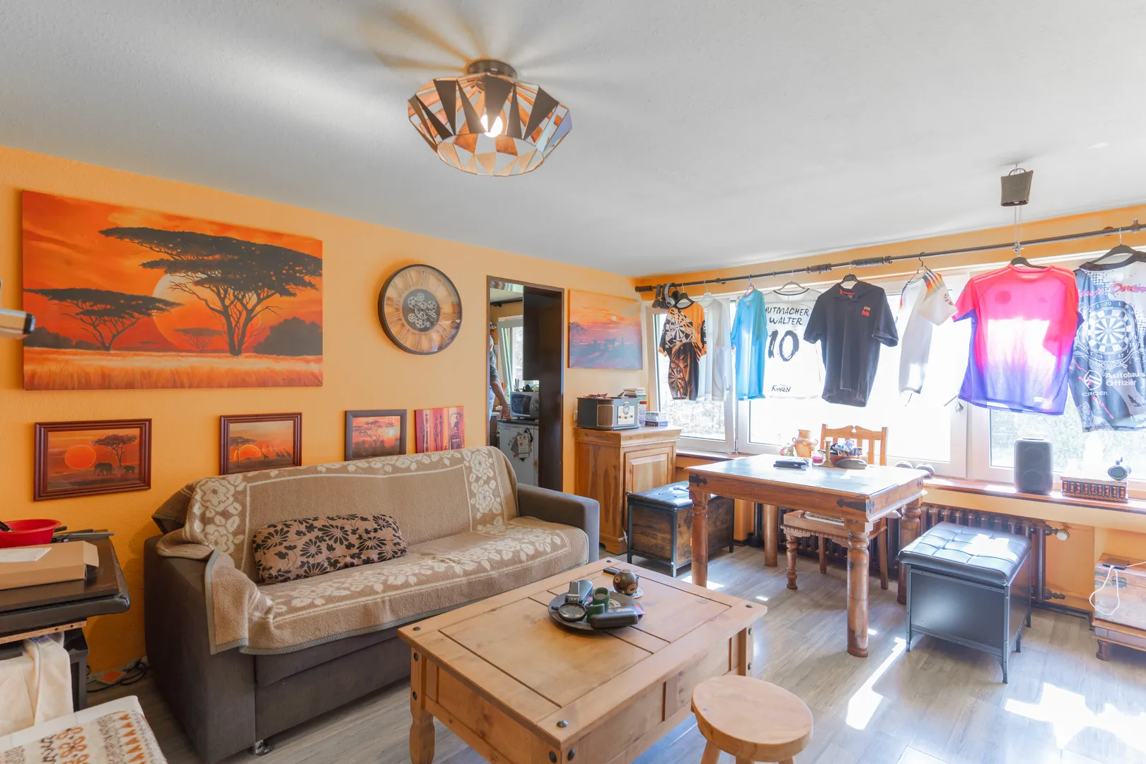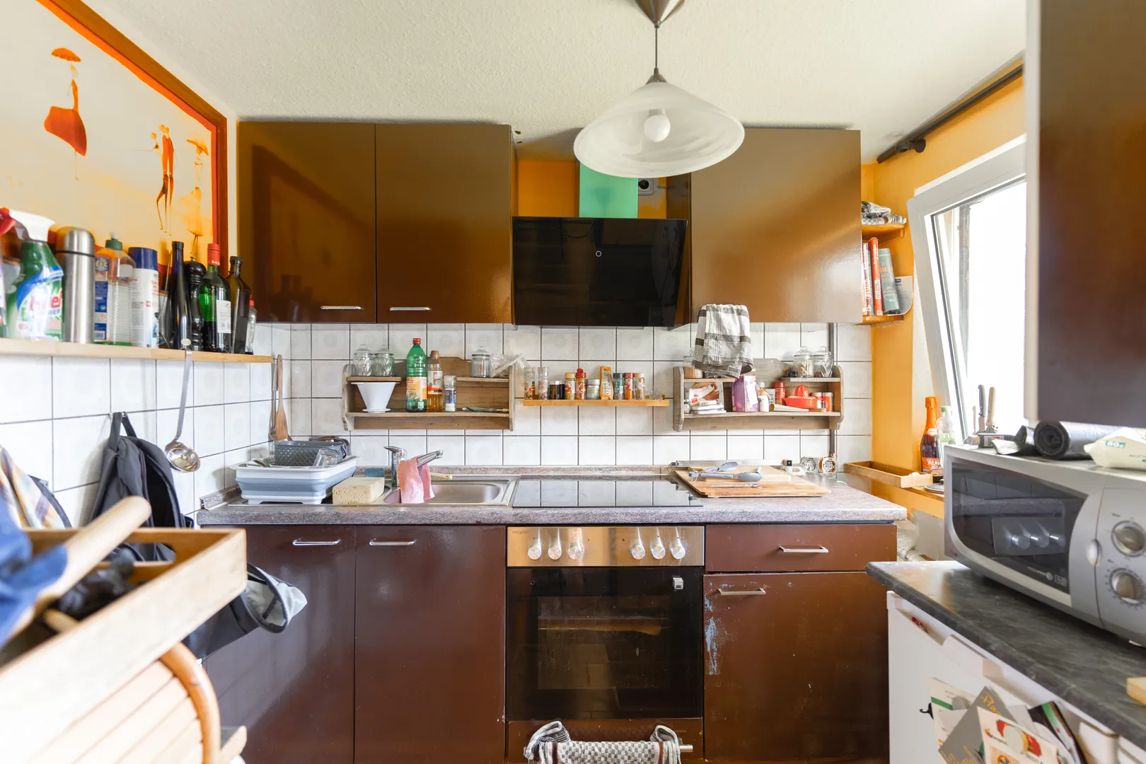 Die separate Küche bietet ausreichend Platz für eine Küchenzeile sowie Stauraum für Küchenutensilien. Sie ermöglicht komfortables Kochen, ohne den Wohnbereich zu beeinträchtigen.
