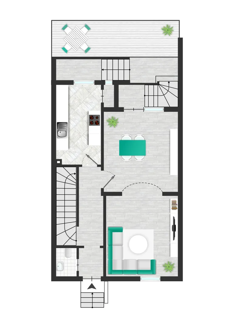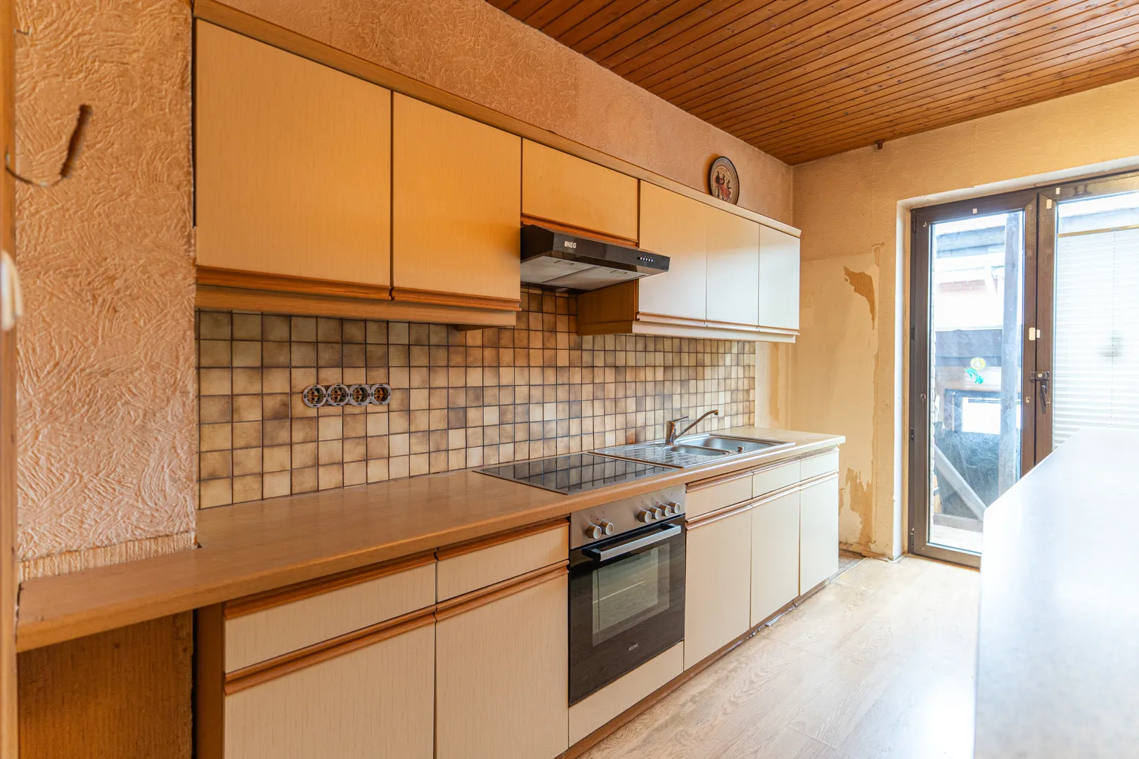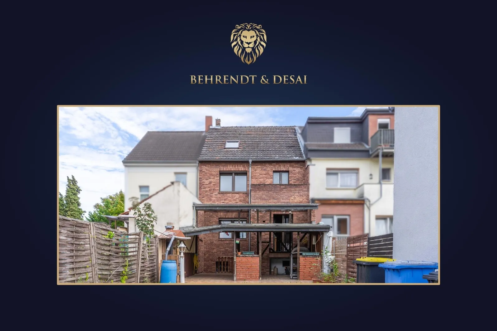 Dieses charmante Reihenhaus bietet mit seiner großzügigen Raumaufteilung auf vier Ebenen eine ideale Grundlage für individuelles Wohnen – auch wenn es in die Jahre gekommen ist und einer Sanierung bedarf. Wer handwerkliches Geschick oder eine klare Vorstellung vom eigenen Traumhaus mitbringt, findet hier die perfekte Basis, um Wohnen nach eigenen Vorstellungen zu gestalten.Im Erdgeschoss stehen ca. 47,8 m² Wohnfläche zur Verfügung. Über einen kleinen Eingangsbereich mit Gäste-WC gelangt man in den zentralen Flur mit Zugang zum Treppenhaus. Geradeaus öffnet sich die separate Küche mit direktem Zugang zum Innenhof – über eine kleine Treppe erreicht man die überdachte Terrasse, die zum Entspannen oder als zukünftige grüne Oase einlädt. Besonders praktisch: Öffnet man das Tor im eigenen Innenhof, gelangt man direkt zu einem privaten Außenstellplatz im hinteren Grundstücksbereich. So haben Sie Ihr Auto immer in unmittelbarer Nähe – ein seltener Komfort in dieser Lage.