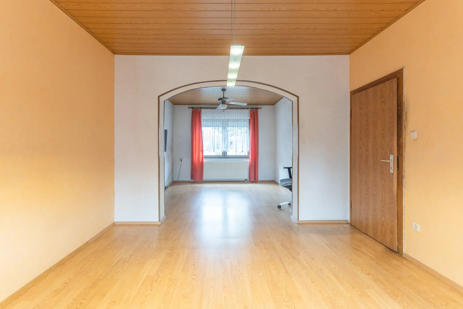 Der angrenzende Wohn- und Essbereich ist durch einen offenen Rundbogen verbunden – ein schöner Grundriss, der sich mit modernen Ideen gut weiterentwickeln lässt.