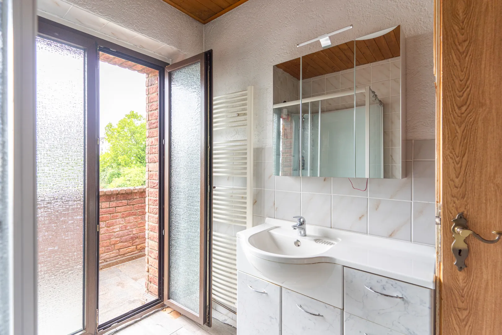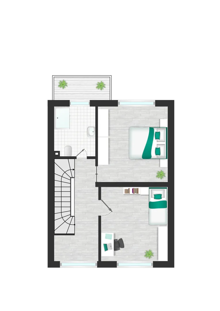 Das Obergeschoss bietet ca. 44,44 m² Wohnfläche mit einem Badezimmer inklusive Balkonzugang, einem Schlafzimmer sowie einem weiteren Raum, ideal als Kinder-, Gäste- oder Arbeitszimmer.